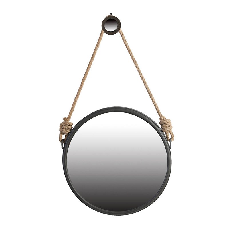 The DesignThe handsome Cleveland Rope Strap Mirror combines modern elements with classic materials for a dramatic contemporary aesthetic. This piece features a simple grey metal frame, suspended from durable rope looped over a matching hanger peg. Measuring at a conservative 19″ in diameter, this mirror is a versatile size for decoration or everyday use.