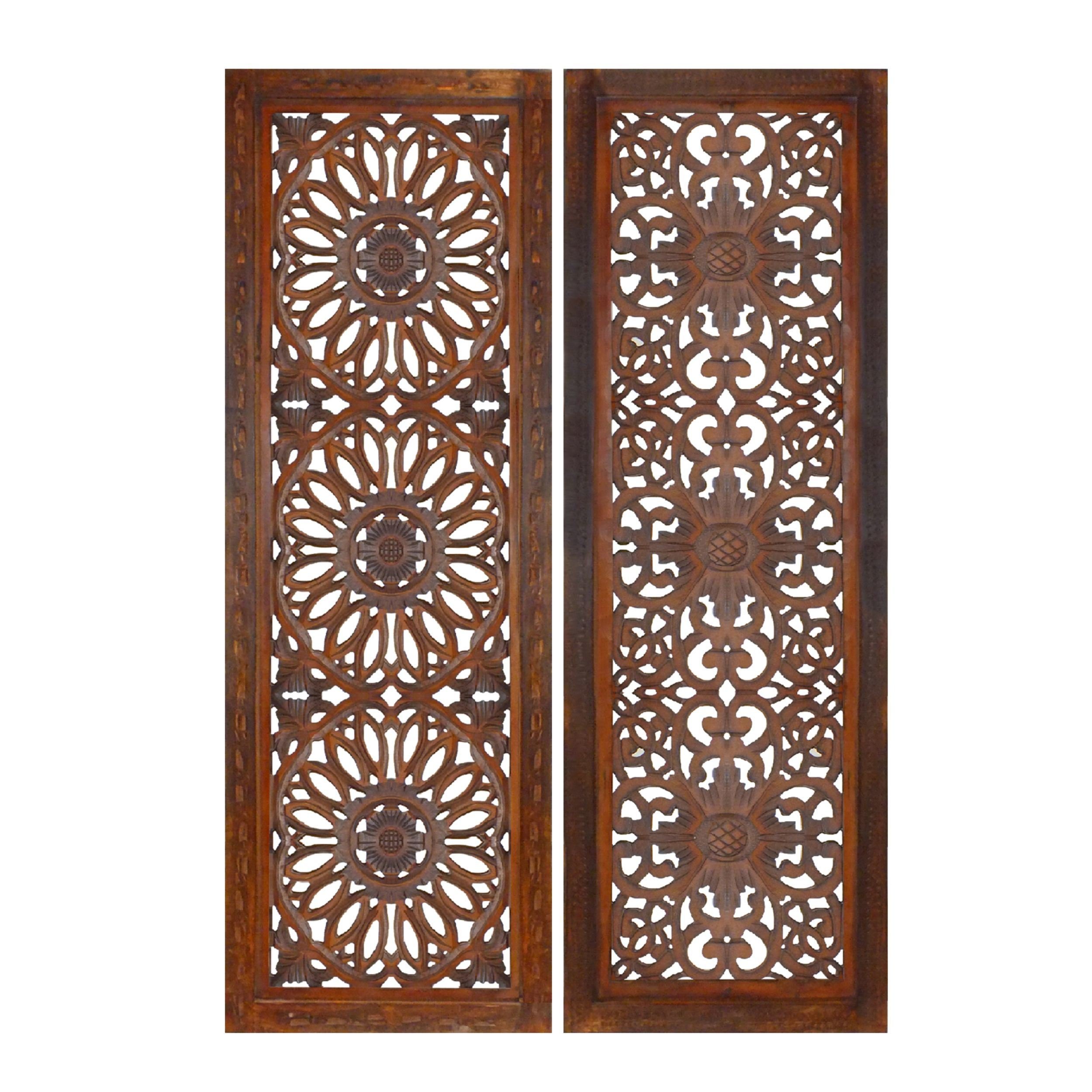 Home > 2 Piece Mango Wood Wall Panel Set with Mendallion Carving, Burnt Brown