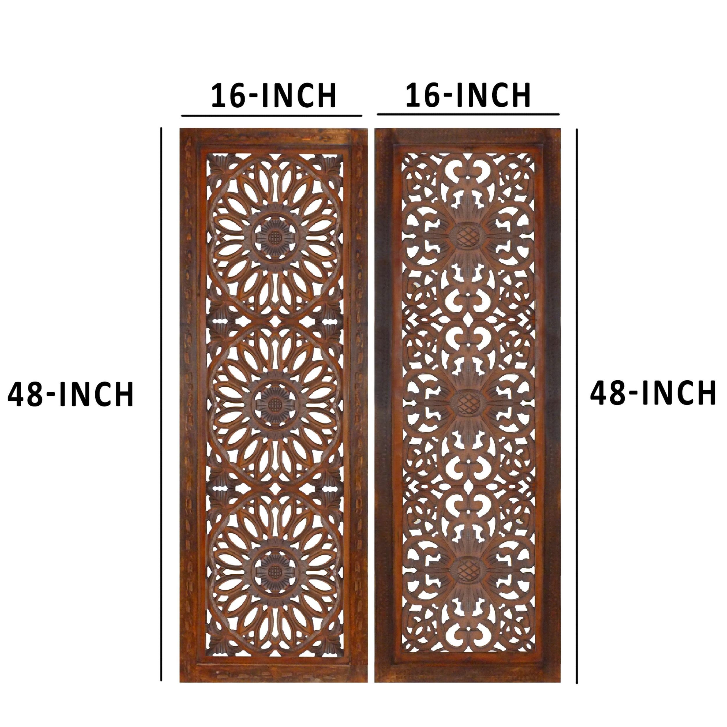 2 Piece Mango Wood Wall Panel Set with Mendallion Carving, Burnt Brown