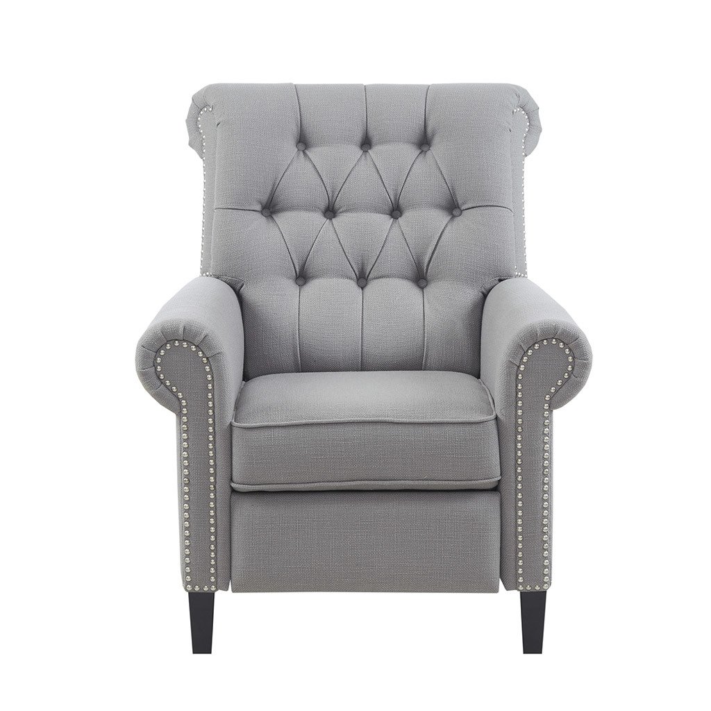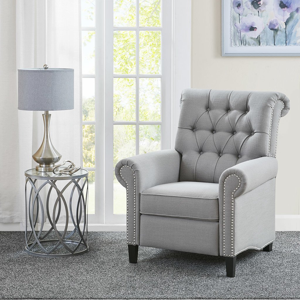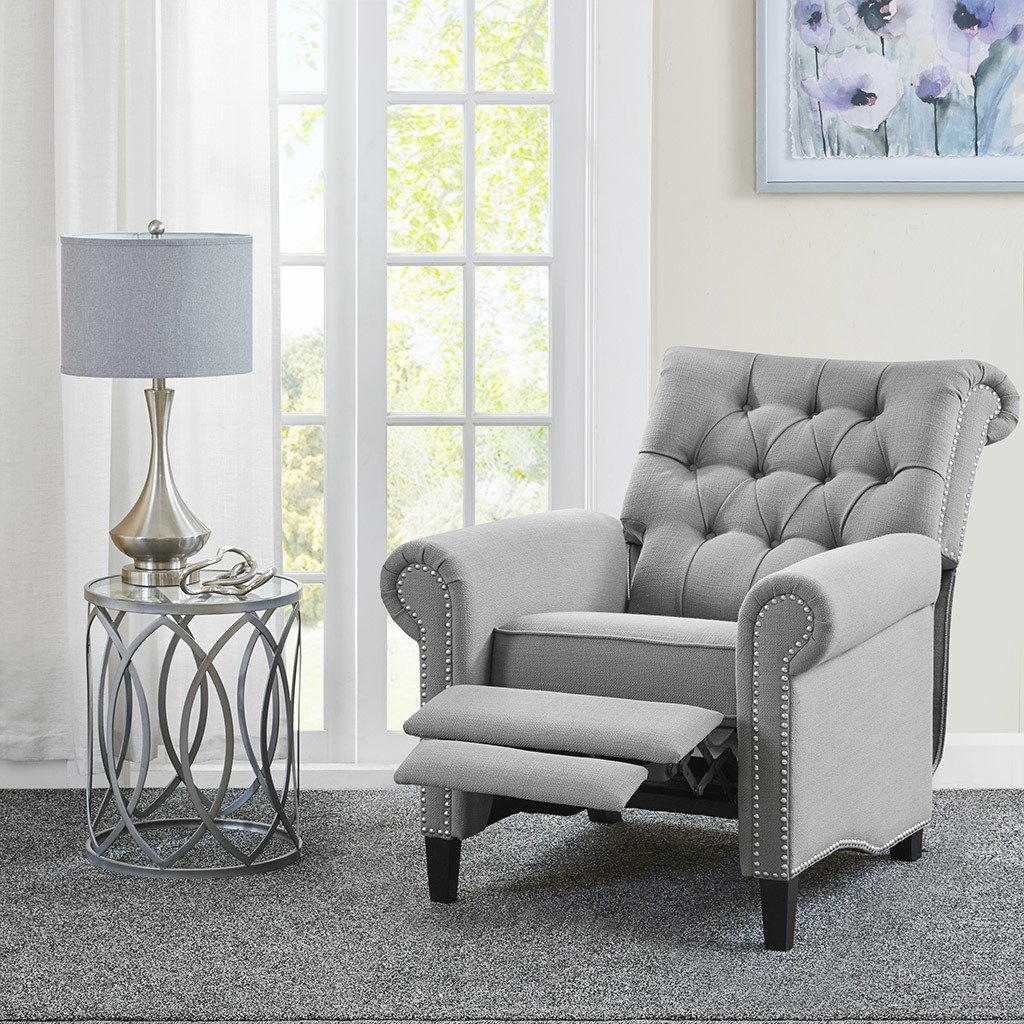 MATERIALMaterial: Solid wood and Ply wood Frame, Solid wood Legs, Solid wood and Ply wood ArmFabric Composition: 92% Polyester; 8% LinenFilling: FoamWood Finish: Black NorNailhead: PewterPRODUCT DETAILSSee below1 Recliner Chair: 32.25"W x 38"D x 40.5"HSeat Dimension: 19"W x 22.5"D x 19.5"HSeat Cushion Thickness: 6.5"Arms Size: 19"W x 25.5"HFront Leg Top Size: 2W" x 2"DFront Leg Bottom Size: 1.5"W x 1.5"DFront Leg height: 5"Back Leg Top Size: 1.75"W x 2.5"DBack Leg Bottom Size: 1.75"W x 1.75"DBack Leg Height: 2.75"Back Rest Size: 30"W x 21"HMaximum Weight Capacity (Seating): 300LBOverall size in Partially reclined: 32.25"Wx49"Dx38.75"HOverall size in fully reclined: 32.25"Wx66"Dx30"HWall Clearance Needed to Fully Recline: 23.5"DescriptionAdd a sophisticated touch to your living room with the Aidan Push Back Recliner. Featuring a high button-tufted back and rolled arms, this recliner chair is upholstered in a rich grey fabric for a charming transitional look. A pewter nail head trim adds an elegant accent to the design, while a black noir finish on the solid wood legs creates a bold contrast. Make a statement in your living room by incorporating this recliner into your décor and elevate the look of your space with its sophisticated style. Partial assembly required and no tools are needed.