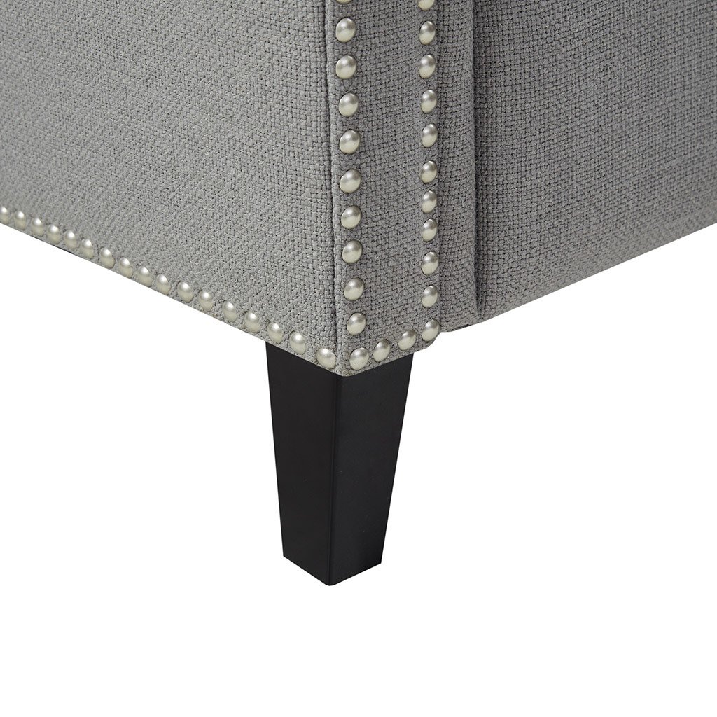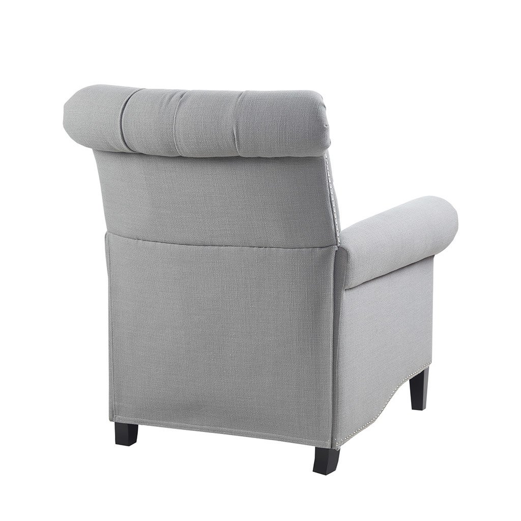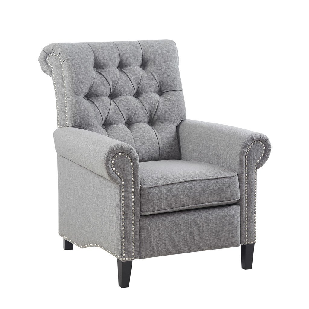 MATERIALMaterial: Solid wood and Ply wood Frame, Solid wood Legs, Solid wood and Ply wood ArmFabric Composition: 92% Polyester; 8% LinenFilling: FoamWood Finish: Black NorNailhead: PewterPRODUCT DETAILSSee below1 Recliner Chair: 32.25"W x 38"D x 40.5"HSeat Dimension: 19"W x 22.5"D x 19.5"HSeat Cushion Thickness: 6.5"Arms Size: 19"W x 25.5"HFront Leg Top Size: 2W" x 2"DFront Leg Bottom Size: 1.5"W x 1.5"DFront Leg height: 5"Back Leg Top Size: 1.75"W x 2.5"DBack Leg Bottom Size: 1.75"W x 1.75"DBack Leg Height: 2.75"Back Rest Size: 30"W x 21"HMaximum Weight Capacity (Seating): 300LBOverall size in Partially reclined: 32.25"Wx49"Dx38.75"HOverall size in fully reclined: 32.25"Wx66"Dx30"HWall Clearance Needed to Fully Recline: 23.5"DescriptionAdd a sophisticated touch to your living room with the Aidan Push Back Recliner. Featuring a high button-tufted back and rolled arms, this recliner chair is upholstered in a rich grey fabric for a charming transitional look. A pewter nail head trim adds an elegant accent to the design, while a black noir finish on the solid wood legs creates a bold contrast. Make a statement in your living room by incorporating this recliner into your décor and elevate the look of your space with its sophisticated style. Partial assembly required and no tools are needed.