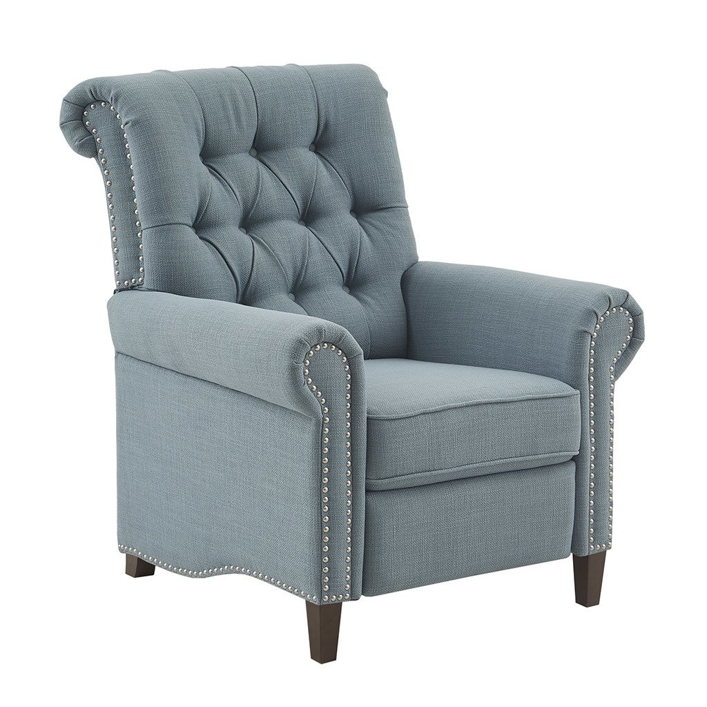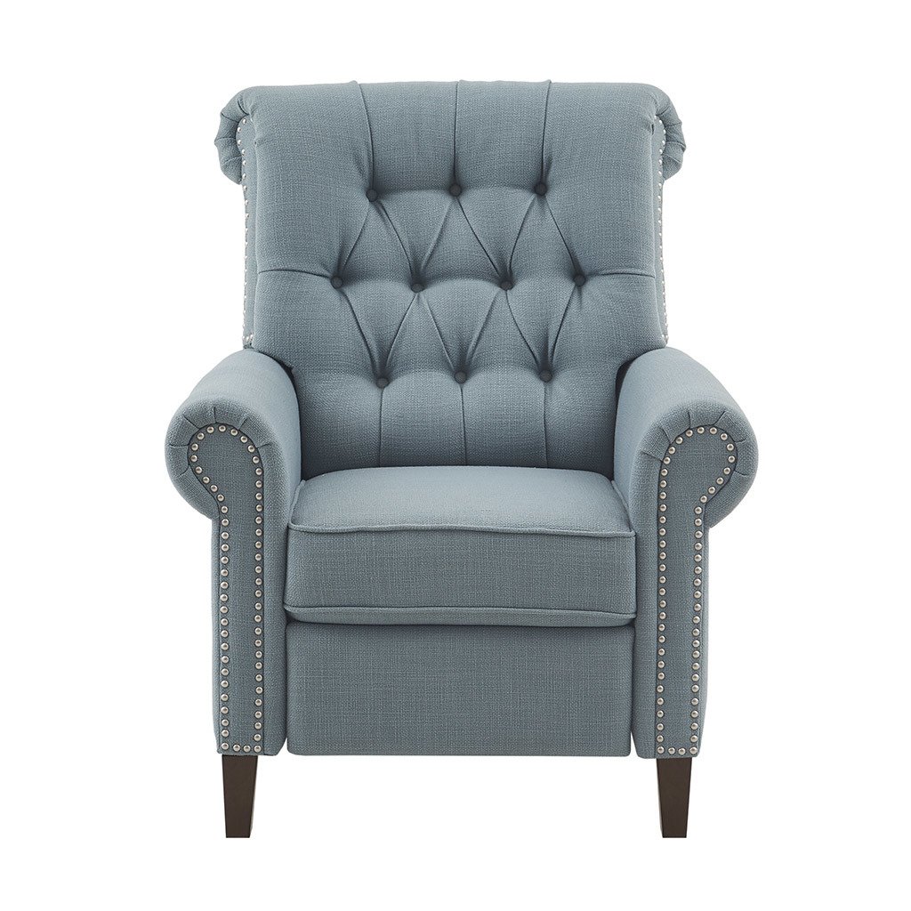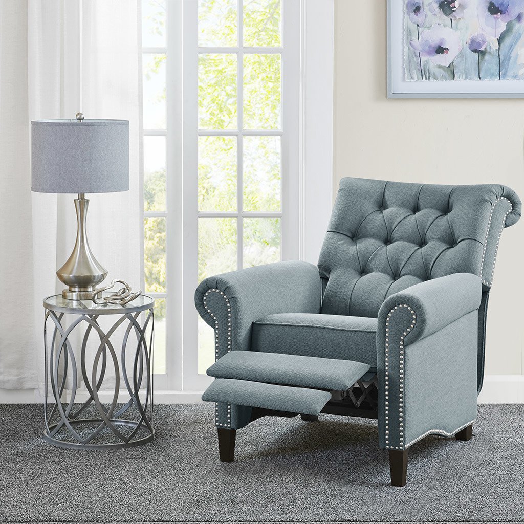 MATERIALSolid wood and plywood frame,Polyester,Linen,Foam Frame Composition: Solid wood and Plywood Leg Material: Solid Wood Wood Finish: Dark Coffee Fabric Composition: 92% Polyester; 8% Linen Seat Construction: Sinuous Springs Cushion or Upholstery Fill Material: Foam Arm Material: Solid wood and Plywood Back Fill Material: Foam and Polyester fiber battingPRODUCT DETAILSSee below1 Recliner: 32.25"W x 38"D x 40.5"HSeat Dimension (WxDxH): 19"W x 22.5"D x 19.5"HSeat Cushion Thickness: 6.5"Arms Size (WxH"): 19"W x 25.5"HFront Upper Legs: 2"W x 2"HFront Bottom Legs: 1.5"W x 1.5"HFront Legs Height: 5"HBack Upper Legs: 1.75"W x 2.5"HBack Bottom Legs: 1.75"W x 1.75"HBack Legs Height: 2.75"HBack Rest Size (WxH): 30"W x 21"HMaximum Weight Capacity (Seating): 300LBSOverall Size in Fully Reclined: 32.25"W x 66"D x 30"HWall Clearance Needed to Fully Recline: 23.5"DescriptionUpdate your living space with the elegant transitional style of the Aidan Push Back Recliner. Rounded arms and a high rounded back give this recliner chair a simple, but beautiful silhouette. The tufted back and bronze nail head trim add an elegant touch to the design, while the removable cushion provides exceptional comfort. This recliner features a dark coffee finish on the solid wood legs and is upholstered in a blue polyester fabric, creating a rich contrast that complements the look. Place the recliner chair in your living room or bedroom, for a comfortable and chic addition to your home. Partial assembly required and no tools are needed. Max weight capacity: 300 lbs.