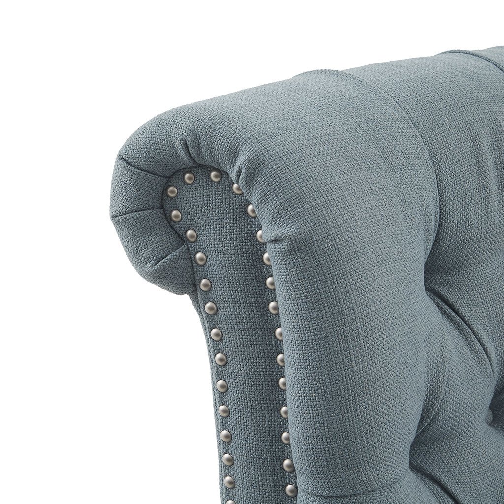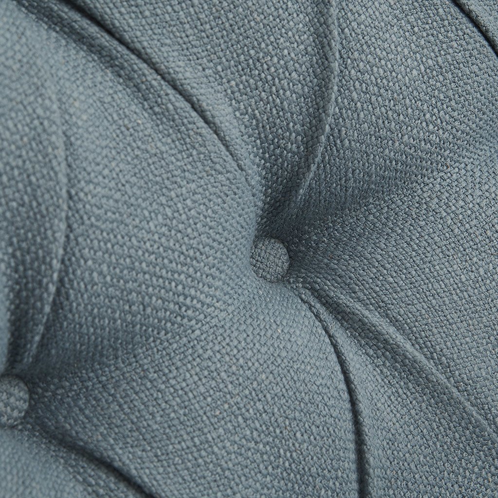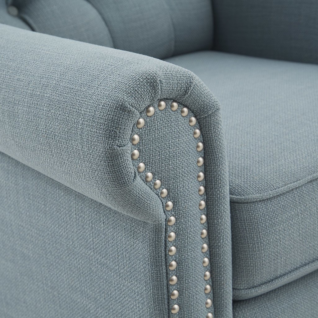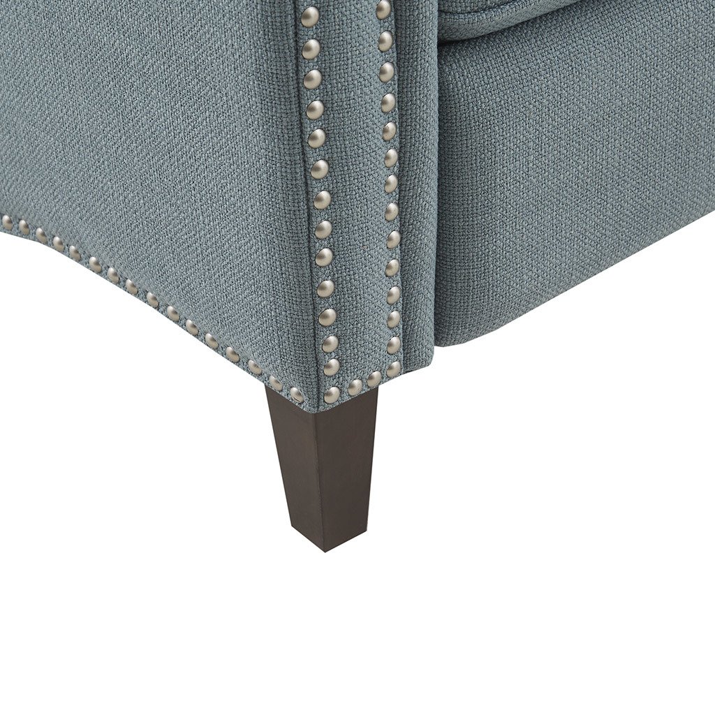 MATERIALSolid wood and plywood frame,Polyester,Linen,Foam Frame Composition: Solid wood and Plywood Leg Material: Solid Wood Wood Finish: Dark Coffee Fabric Composition: 92% Polyester; 8% Linen Seat Construction: Sinuous Springs Cushion or Upholstery Fill Material: Foam Arm Material: Solid wood and Plywood Back Fill Material: Foam and Polyester fiber battingPRODUCT DETAILSSee below1 Recliner: 32.25"W x 38"D x 40.5"HSeat Dimension (WxDxH): 19"W x 22.5"D x 19.5"HSeat Cushion Thickness: 6.5"Arms Size (WxH"): 19"W x 25.5"HFront Upper Legs: 2"W x 2"HFront Bottom Legs: 1.5"W x 1.5"HFront Legs Height: 5"HBack Upper Legs: 1.75"W x 2.5"HBack Bottom Legs: 1.75"W x 1.75"HBack Legs Height: 2.75"HBack Rest Size (WxH): 30"W x 21"HMaximum Weight Capacity (Seating): 300LBSOverall Size in Fully Reclined: 32.25"W x 66"D x 30"HWall Clearance Needed to Fully Recline: 23.5"DescriptionUpdate your living space with the elegant transitional style of the Aidan Push Back Recliner. Rounded arms and a high rounded back give this recliner chair a simple, but beautiful silhouette. The tufted back and bronze nail head trim add an elegant touch to the design, while the removable cushion provides exceptional comfort. This recliner features a dark coffee finish on the solid wood legs and is upholstered in a blue polyester fabric, creating a rich contrast that complements the look. Place the recliner chair in your living room or bedroom, for a comfortable and chic addition to your home. Partial assembly required and no tools are needed. Max weight capacity: 300 lbs.