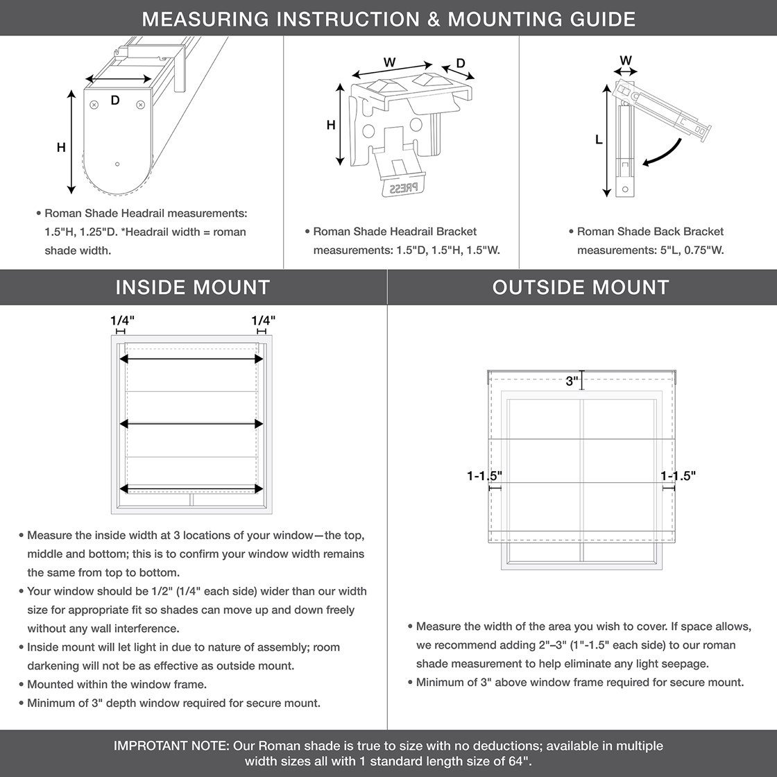 DescriptionThe Madison Park Eastfield Bamboo Light Filtering Roman Shade offers a natural and eco-friendly update to your home. This roman shade is made from a 100% bamboo woven material with unique variations in the color, for an organic look and feel. Overlapping bamboo slats provide a light filtering effect and enhanced privacy, while adding dimension and warmth to your room. This bamboo shade also features a cordless Lift/Pull Mechanism for easy daily use; while the brackets on the bottom can easily be snapped in to keep shades straight and secured in place. Please note: this bamboo shade does feature exposed cords on reverse for construction to connect natural slats; reverse images provided for reference. Ready to install right out of the packaging, this natural roman shade can be hung inside or above the window frame to give your window a clean, finished profile without dangling lift cords. The bamboo panel measures 64-inches long and comes in multiple width options to suit multiple standard window sizes. Using self-sustaining bamboo and other natural materials, each environmentally friendly roman shade is sold as a single unit and comes with hardware and a printed instructional guide. Assembly is required. Due to nature of material, colors and shade length may vary slightly and some stretch, shrink, and warpage may occur for any natural woven product. Natural woven materials can also be affected by temperature and humidity; mold may occur and should be vacuum cleaned as needed. Do not use any harsh chemicals or water to clean as natural bamboo material will be damaged over time from excessive moisture.Product Details33x64"1 Roman Shade:33"W x 64"LHead Rail:33"W x 1.61"D x 1.13"HRecommend Mounting Depth:1.75"Material100% bamboo