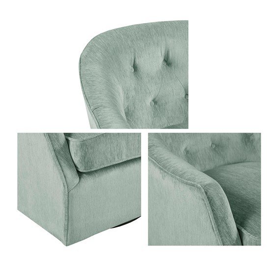MATERIALMaterial: Solid wood and plywood frame, Upholstered seatFabrication: 100% PolyesterFilling: High Density FoamWood/Metal Finish: Black Metal SwivelPRODUCT DETAILSSee below1 Swivel Chair: 30.3"W x 31.85"D x 29.725"HSeat: 22.8"W x 23.75"D x 19.3"HSeat Cushion Thickness: 7"Arms: 20.8"W x 22.75"HArm Height - Top to Bottom: 22.75"Maximum Weight Capacity: 300 lbsDescriptionClassic meets contemporary with the Calvin Swivel Chair. The curved wide back features elegant button tufts that add charm and elegance to the design. A high-density foam filling and solid wood frame provide exceptional comfort and support. The swivel feature allows the lounge chair to rotate on its black metal base. Upholstered in a soft light green velvet fabric, this swivel chair fits in any room of your home. No assembly required.