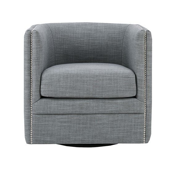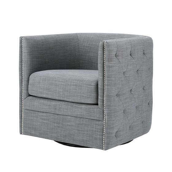 MATERIALMaterial: Solid wood and plywood frame, Upholstered seatFabrication: 80%Polyester, 20% LinenFilling: High Density FoamWood/Metal Finish: Black Metal SwivelNailhead: SilverPRODUCT DETAILSSee belowOverall: 29.5"W x 31.5"D x 28.5"HSeat: 21.5"W x 24"D x 19"HArm Size: 29.5"W x 28.5"HBack Rest: 21.5"W x 9.5"HWeight: 56 lbsWeight Capacity: 300 lbsDescriptionUpgrade your living room with this tufted barrel swivel chair. Its curved back and arms, nailhead accents, and rich upholstery make it a luxurious addition to any space. With high-density foam and a sturdy wood frame, it provides exceptional comfort and support. The swivel chair comes fully assembled for hassle-free setup.
