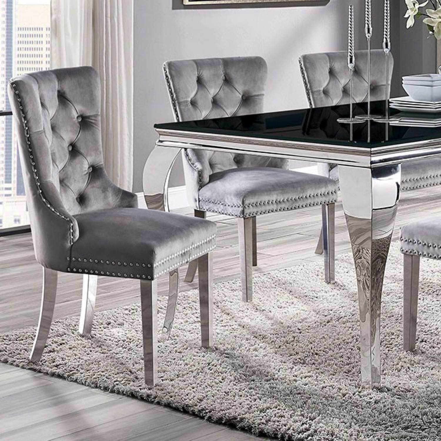 Of relief to those seeking a truly fine chair, this beauty may exceed their wishes. The extraordinary flannelette fabric portrays an authentic velvet-like quality. It is finely button-tufted for the classic appearance expected of a elegantly constructed fashionable side-chair. Studded accents outline the edges and a unique metallic pull ring adds often-neglected visual appeal to the back. The mirror-like sheen of the steel legs offer a modern touch, ensuring a presence of stature as well as providing the expected seated comfort.