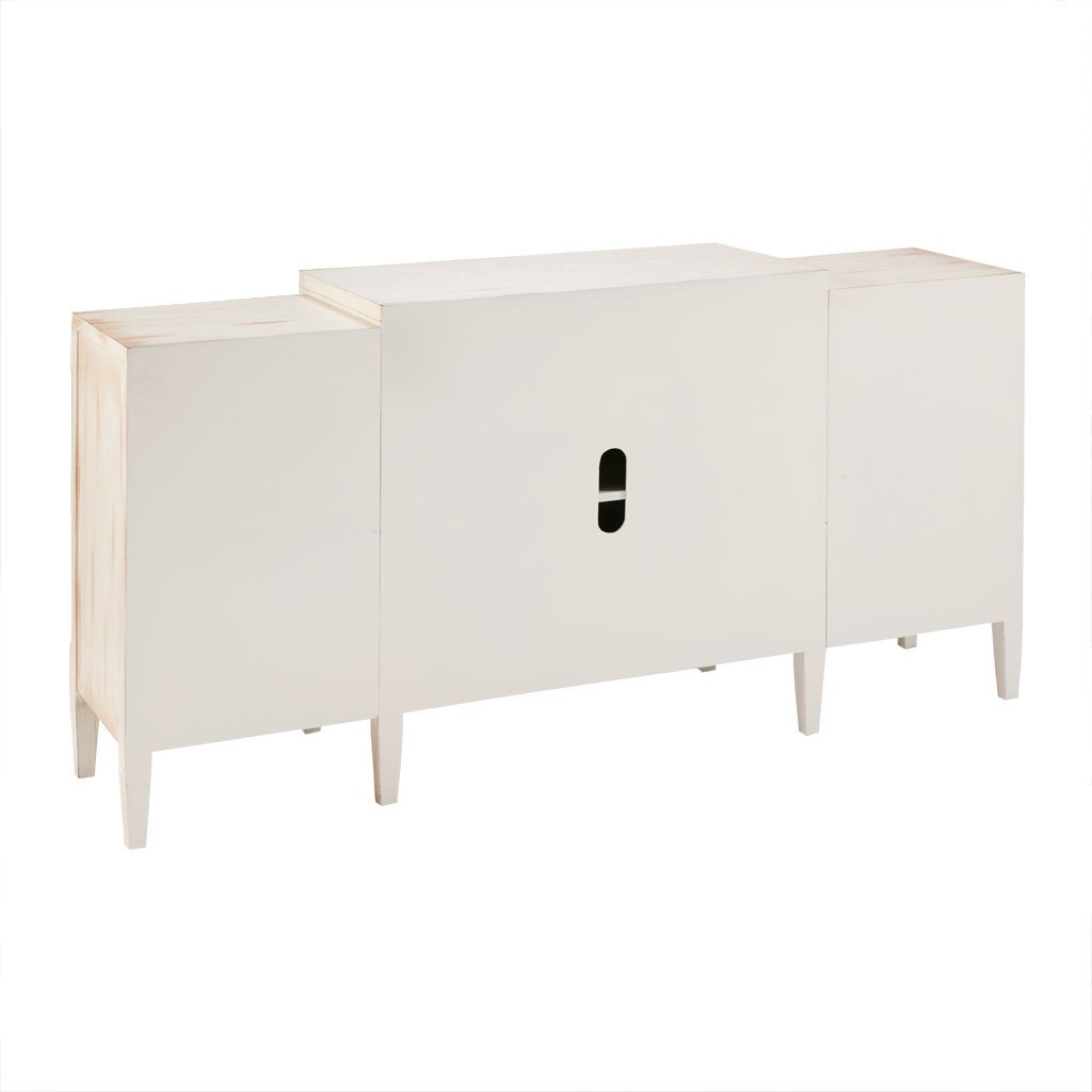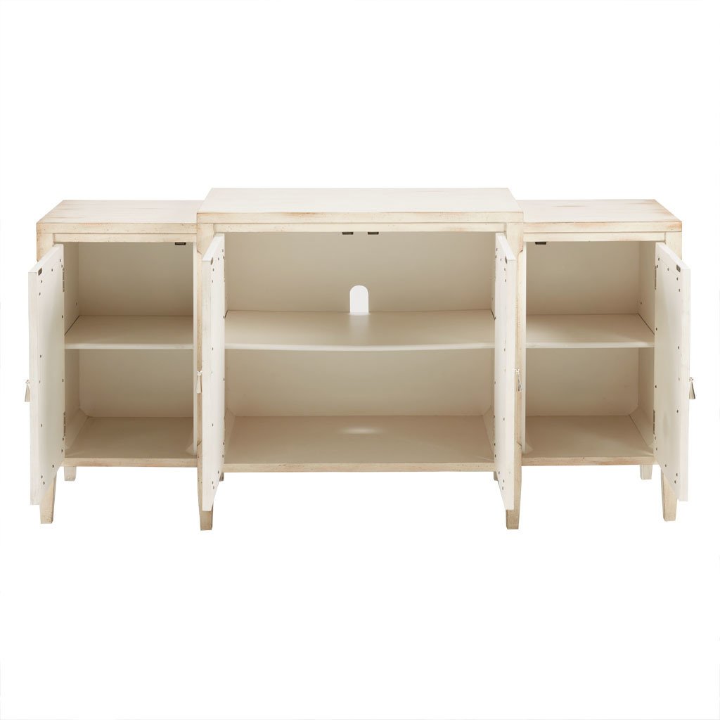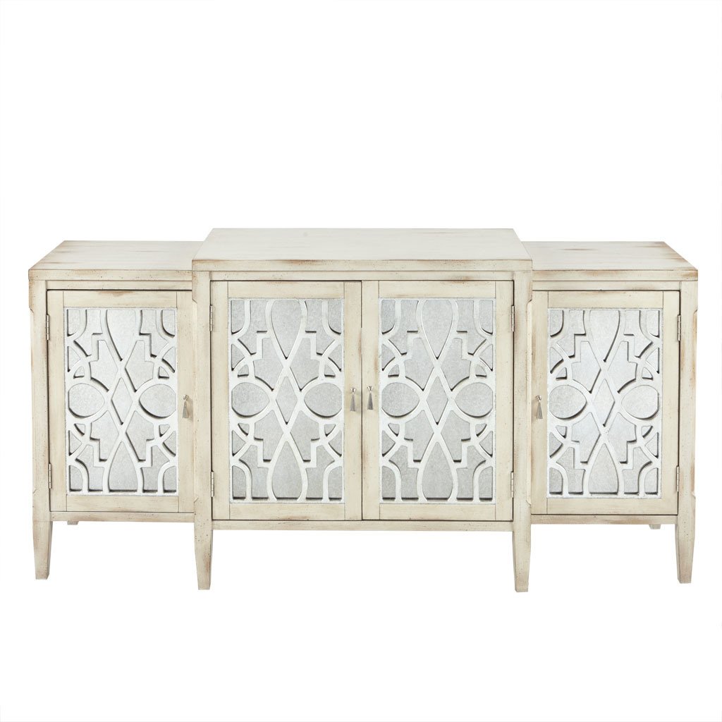 DescriptionIntroduce a natural elegance to your decor with the Folio Buffet. Featuring an antique white and silver leaf wood finish, this buffet provides plenty of space to store your flatware and glasses. The four doors stay securely shut with magnetic catches and open up to reveal an adjustable shelf. Beautifully crafted with silver trim work, this wood buffet adds a luxurious look to your dining room. Assembly is required.MaterialFrame Material: Manufactured WoodLeg Material: Solid WoodWood Finish : Antique White and Silver leafProduct DetailsSee below1 Buffet:68"W x 18"D x 34"HLegs Size (Upper):1.75"W x 1.75"DLegs Size (Bottom):1.125"W x 1.125"DLeg Height:6.25"Side Top Size:17"W x 18"D x 1"TCenter Top Size:34"W x 18"D x 1"TShelf Qty:3Side Shelf Size:14.375'W x 14'D x 0.625'TCenter Shelf Size:30.375'W x 16.25'D x 0.625'TInterior Size Above Shelf(Side):14.375'W x 14'D x 11.5'HInterior Size Above Shelf(Center):30.375'W x 16.25'D x 12.25'HInterior Size Below Shelf (Side):14.375'W x 14'D x 11.5'HInterior Size Below Shelf (Center):30.375'W x 16.25'D x 12.25'HClearance Below Storage:5.75"Maximum Weight Capacity (Top):150 lbsMaximum Weight Capacity (Shelf):75 lbs