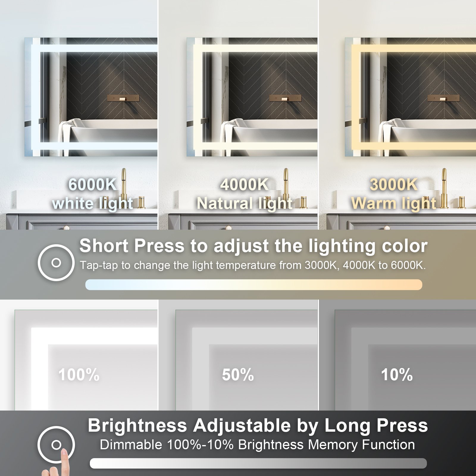 The bathroom mirror with LED light; Made of high qualit Anodized aluminum can be used for long time. High tech Intelligent bathroom vanity makeup mirror with defogging function. Touch sensor button can adjustable mirror color brightness from 2700K-6300K to meet the needs of different light. Brightness can be adjusted freely from 10 % to 100%. Large size bathroom mirrors wall mounted design; it is space-saving. Bright mirror can make your bathroom or living room can be more spacious; Better mood. Perfect for bathroom; bedroom; dressroom; powder room and more.