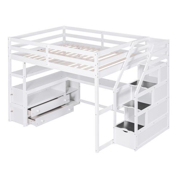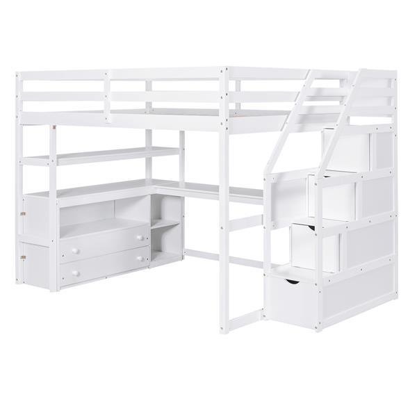 Full Size Loft Bed with Desk and Shelves, Two Built-in Drawers, Storage Staircase, White
