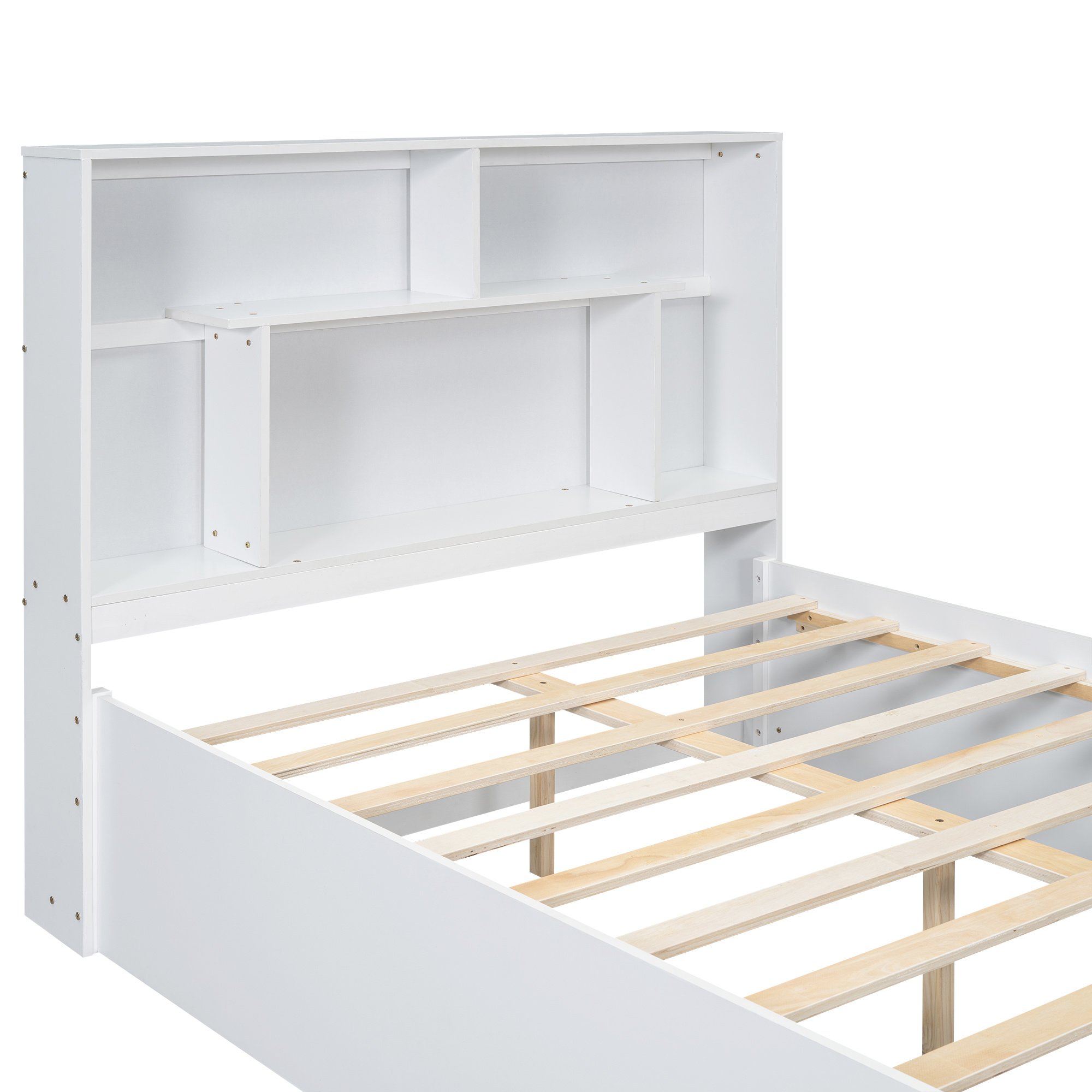This storage platform bed is simple and fashionable. The headboard features 4 shelves, with 2 drawers, offering you convenient storage space for daily necessities. The whole construction is made of solid wood and MDF, so it's designed for long-term use.