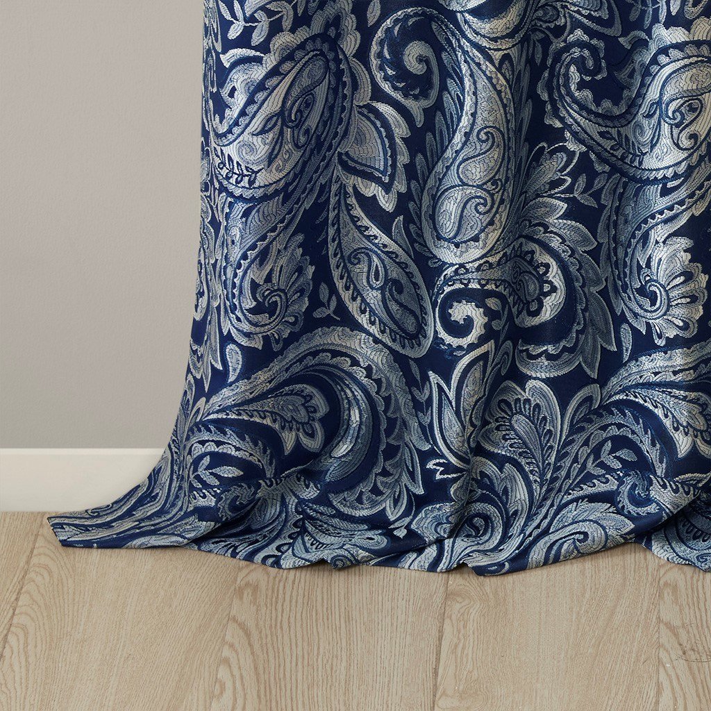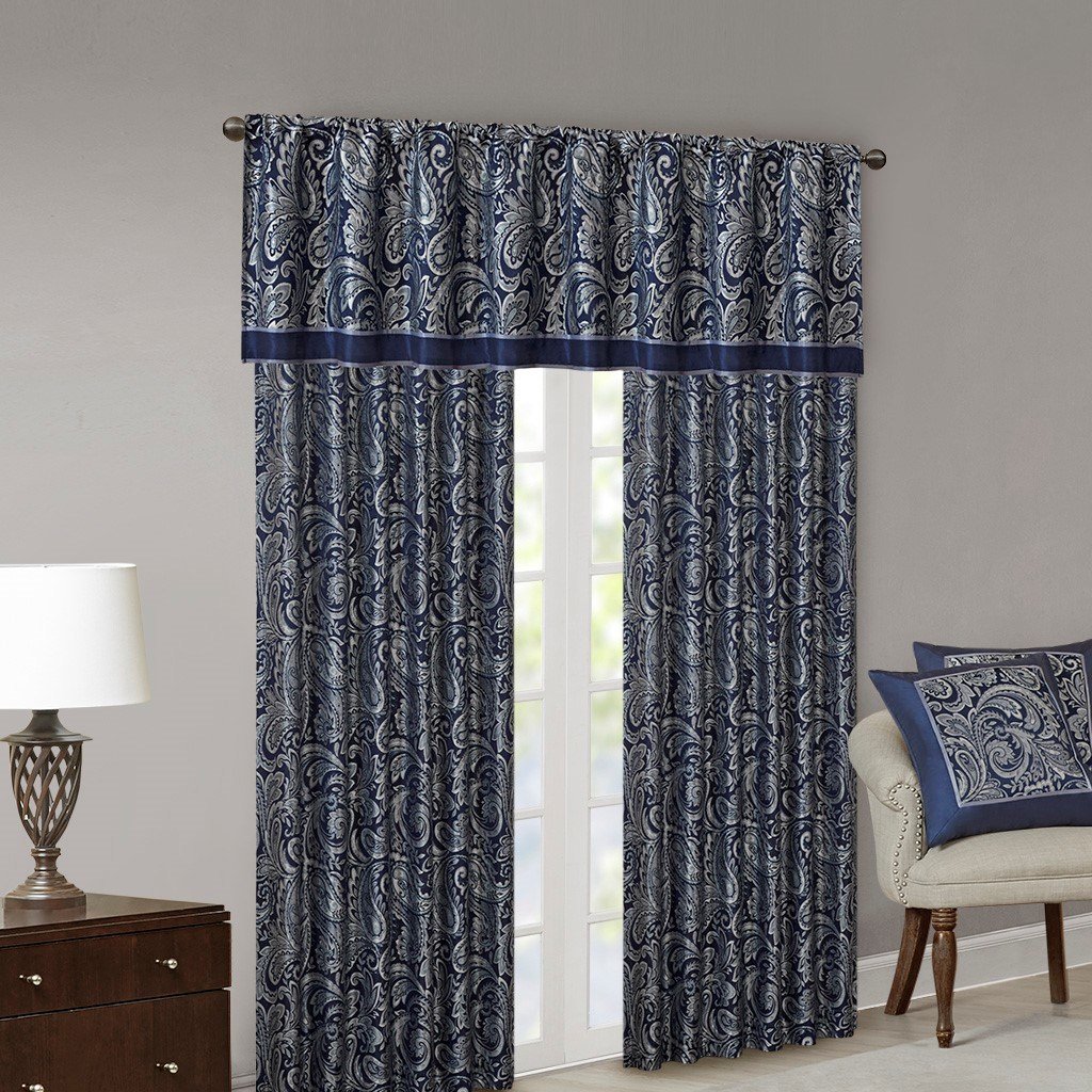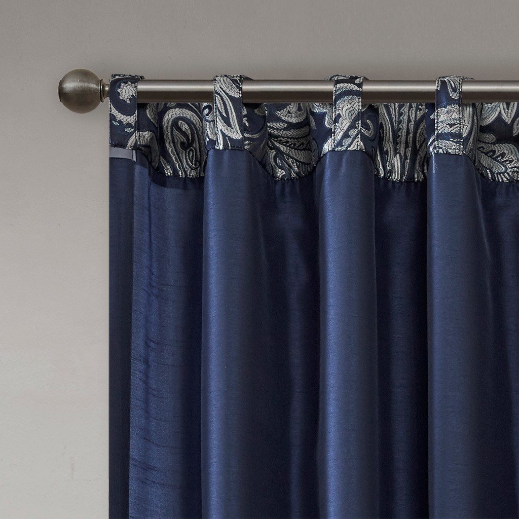 DescriptionFor a luxuriously classic style, our Madison Park Aubrey Window Curtain Pair is the perfect touch to your decor. The alluring jacquard weave is inspired from an updated paisley motif and is woven in beautiful hues of navy, ivory, and a hint of silver for a shimmering accent. The window panels are pieced with solid faux silk and beautiful flat piping details in gold, creating an elegant look. While also achieving the OEKO-TEX certification, meaning it does not contain any harmful substances or chemicals, ensuring quality comfort and wellness. Rod pocket or back tabs top finish makes this curtain easy to hang, open, and close panels throughout the day; while fitting up to a standard 1.25" diameter rod. Coordinating bedding is also available and sold separately.Product Details50x95"2 Window Panels:50"W x 95"L (2)Material100% polyester, rod pocket and back tabs