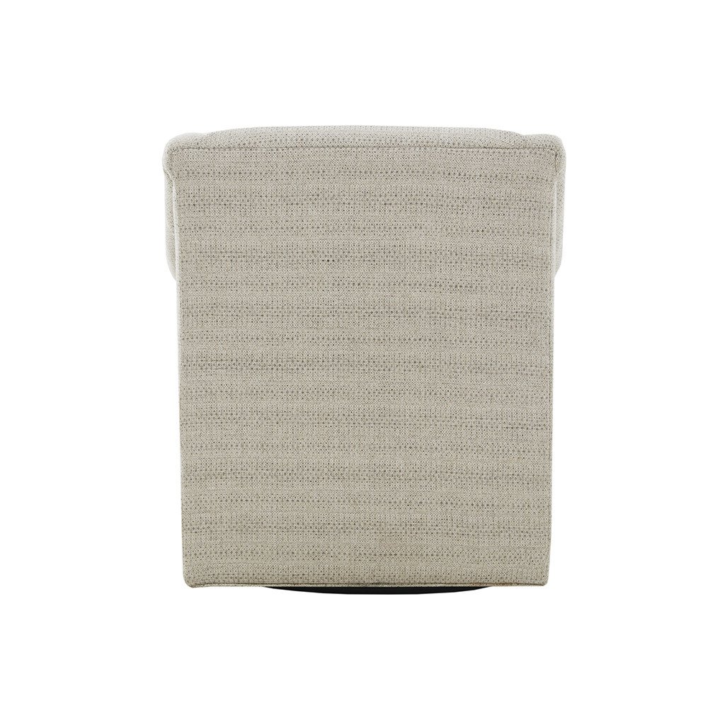 MATERIALFrame Composition:Solid wood + Plywood Leg Material:Metal Glinder Swivel Base Arm Material:Solid wood + Plywood Fabric Composition:100% Polyseter Cushion or Upholstery Fill Material:Foam Metal Finish:BlackPRODUCT DETAILSSee below1 Swivel Glider Chair: 29.5"W x 30.25"D x 34.5"HSeat Dimension: 21"W x 20"D x 19.5"HSeat Cushion Thickness: 6.5"Arms Size: 21"W x 24.5"HSwivel base: Dia22" x 1.75"HBack Rest Size: 21.25"W x 15"HMaximum Weight Capacity: 300 lbsDescriptionUpdate Your Living Room Decor With Simple Style And Comfort Of The Justin Swivel Glider Chair. Upholstered In Tonal Jacquard Fabric With Subtle Grey And Cream Hues, This Swivel Chair Features Round Arms And Tight Back For A Chic Transitional Look. The Swivel Glider Base Allows The Chair To Rotate 360 Degrees And Rock Back And Forth, While The Removable Cushion Provides Exceptional Comfort. Incorporate This Swivel Glider Chair Into Your Living Room To Add Style And Comfort To Your Home Decor.
