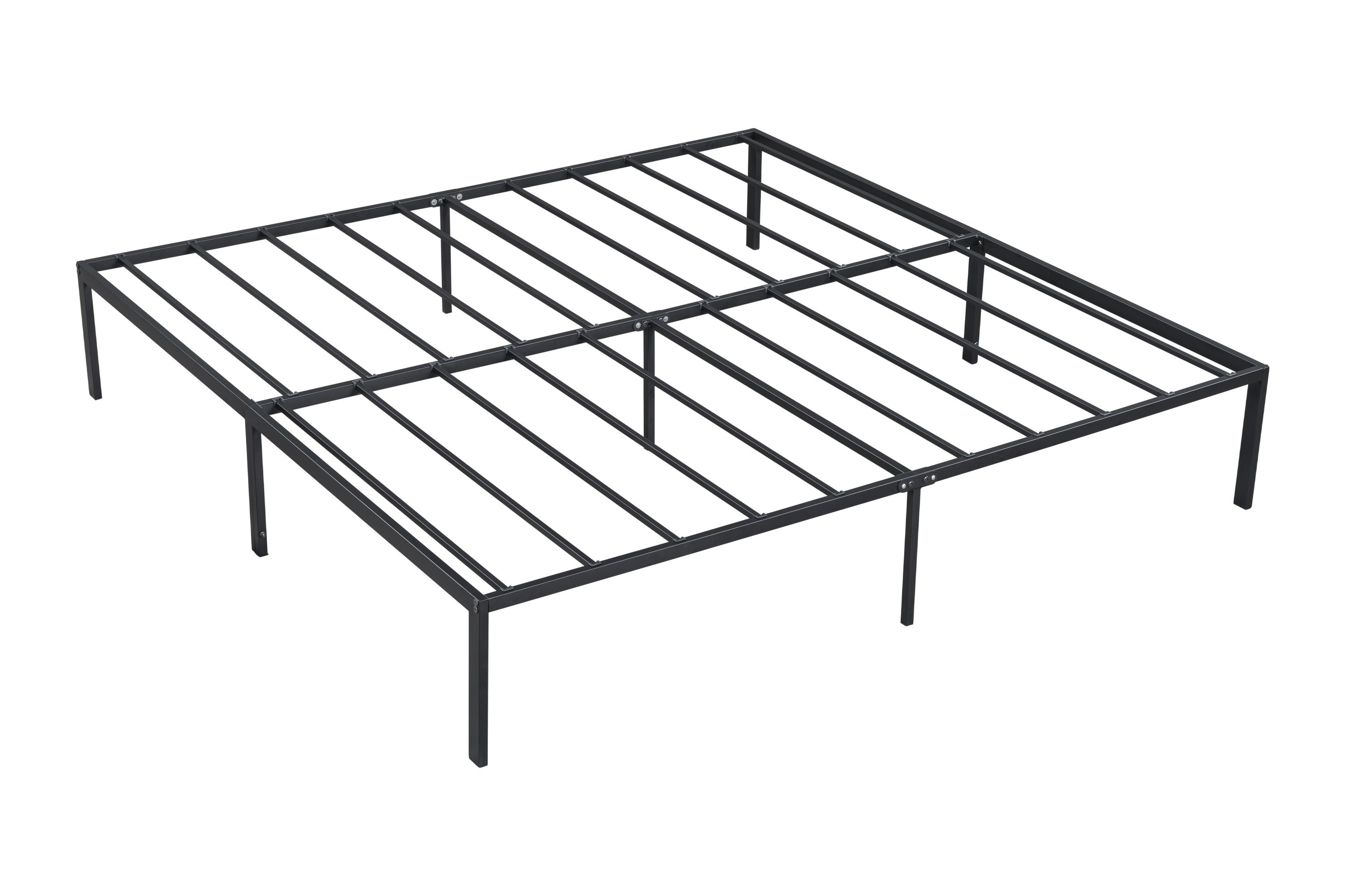 King Size Metal Bed FrameCrafted from premium steels, our bed frame is a testament to a meticulous engineering process that prioritizes both comfort and durability. The robust metal construction establishes a stable foundation for your mattress, while the slatted base promotes optimal air circulation, creating a comfortable and well-ventilated sleeping environment. The quick-installation slats not only reduce the time of assembling but also minimize creaks and squeaks. It ensures a quiet sleeping experience, allowing you to enjoy the tranquility of a peaceful night's rest.Adding a touch of modern style to your bedroom, the metal bed frame boasts a cool and straightforward wrought iron design. Its smooth and simple aesthetic effortlessly complements various decor styles, making it a versatile addition to your bedroom, guest room, dorm, or hotel. Beyond its stylish appeal, this bed frame is equally practical, offering a 12" height under the bed for storage -- providing ample space to keep your room organized. Say goodbye to bulky box springs and embrace the smart space-saving solution that not only enhances the visual appeal of your space but also maximizes your living area. Make your room look even better with this sleek, functional, and pretty bed frame.