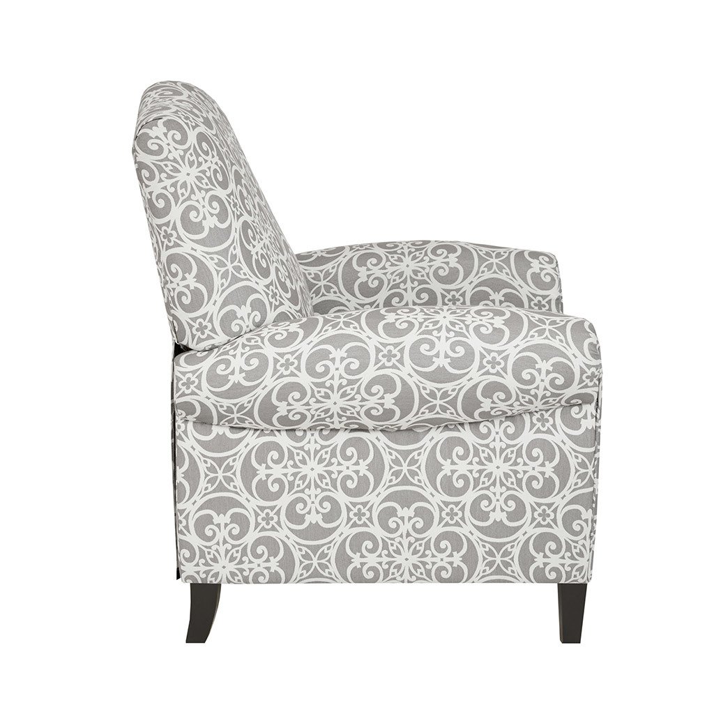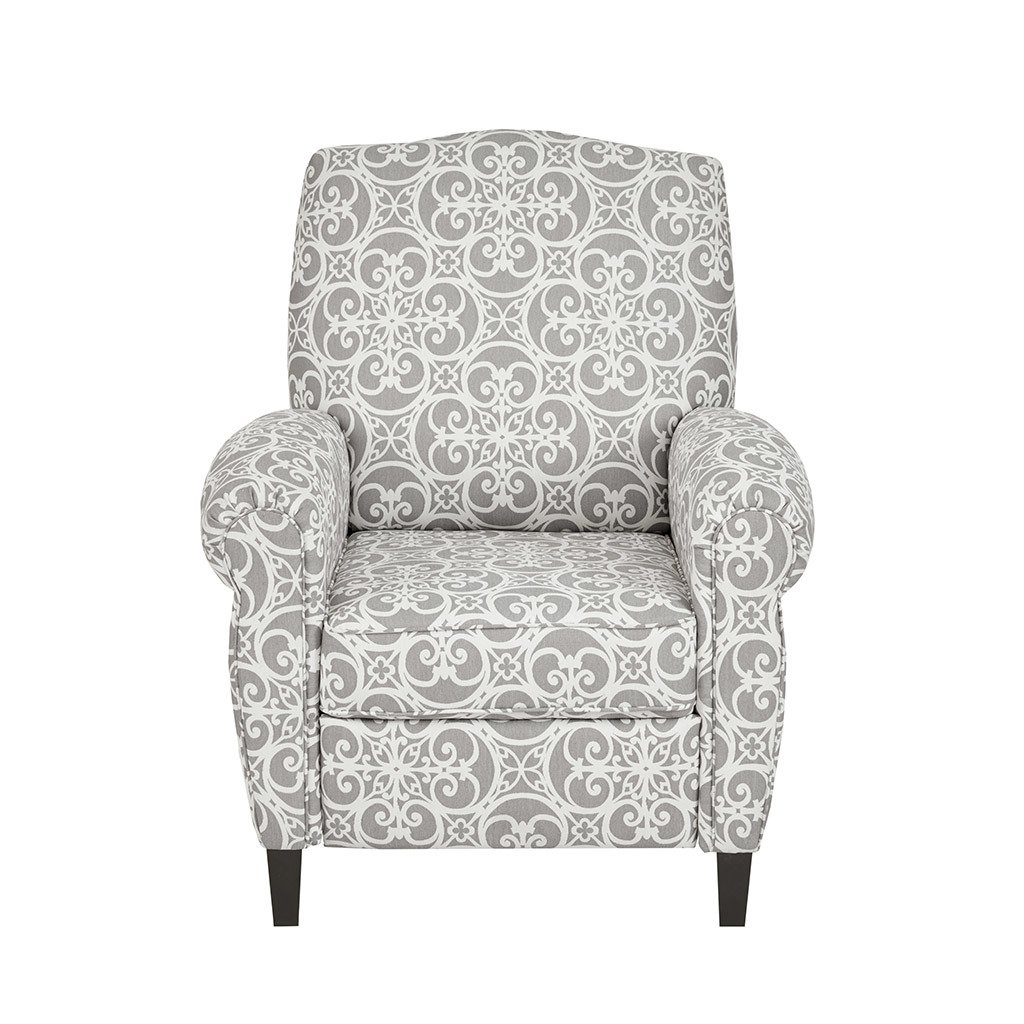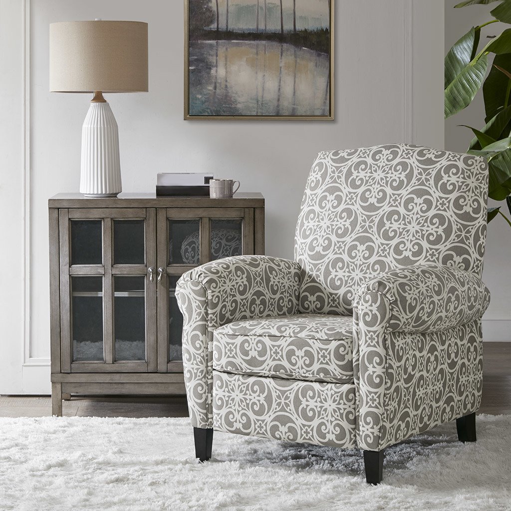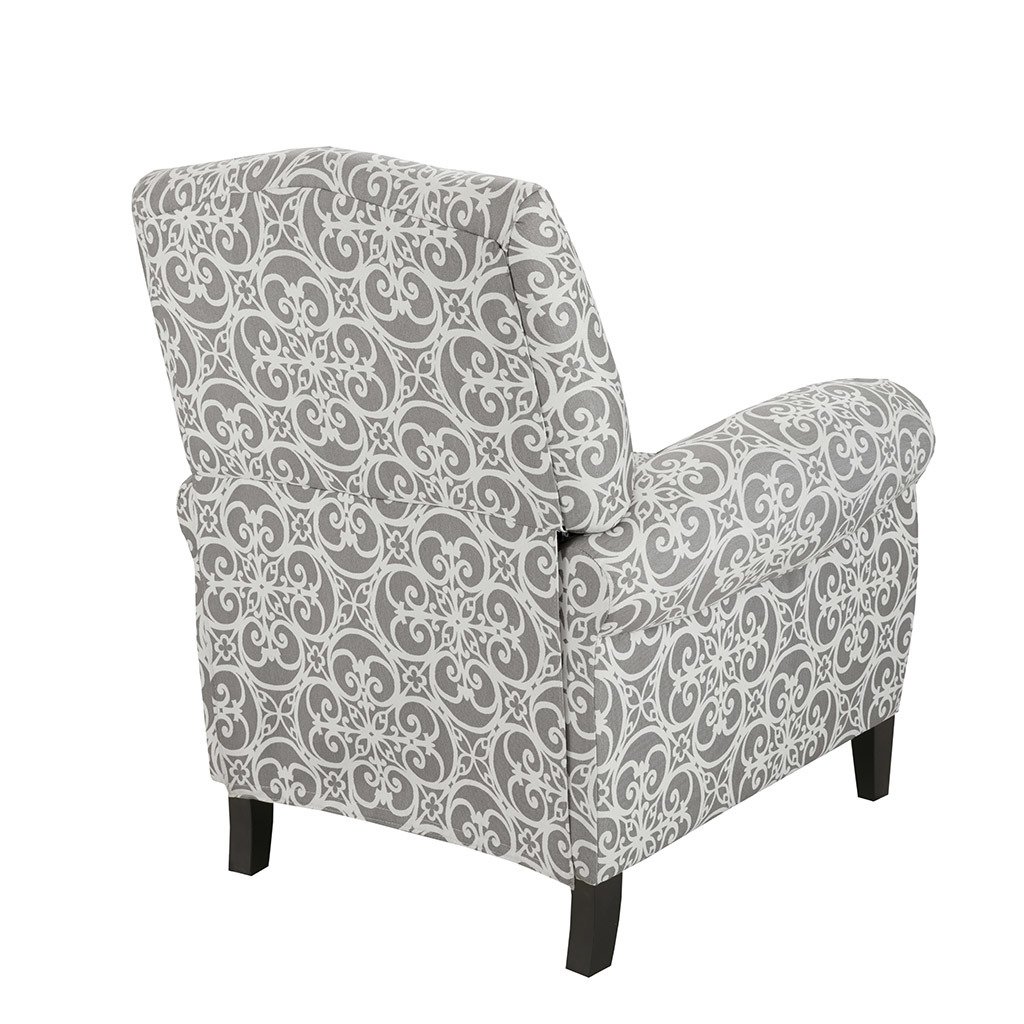 MATERIALMaterial: Solid wood and plywood frame, solid wood legs, Upholstered seat and backArm Material: solid wood and plywoodFabrication: 56% Rayon, 44% PolyesterFilling: FoamWood Finish: Black NoirPRODUCT DETAILSSee below1 Recliner Chair: 34"W x 34.5"D x 41.5"HOverall Size in Fully Reclined: 34"W x 65"D x 33.25"HSeat Dimension: 19.5"W x 22.25"D x 19.5"HSeat Cushion Thickness: 7"Arms Size: 19.5"W x 26"HFront legs(Top): 2"W x 2"DFront legs(Bottom): 1.5"W x 1.5"DFront Legs Height: 5"Back legs(Top): 1.75"W x 2"DBack legs(Bottom): 1.75"W x 1.5"DBack Legs Height: 5"Distance Between Legs(Front to front): 25.25"Distance Between Legs(Front to back): 30"Distance Between Legs(Back to Back): 25.25"Back Rest Size: 25"W x 22"HWall Clearance Needed to Fully Recline: 22"Maximum Weight Capacity: 300 LBSDescriptionBeautifully designed, the Kirby Push Back Recliner makes a stunning statement in any room. This recliner chair features a high camel back and rolled arms in grey upholstery with an elegant fretwork print, for a chic transitional look. The solid wood legs display a black finish to create a rich contrast that complements the design, while a removable cushion provides exceptional comfort. With an elegant silhouette, this recliner chair offers a luxurious and fashionable update to your home décor. Partial assembly required and no tools are needed. Max weight capacity: 300 lbs.