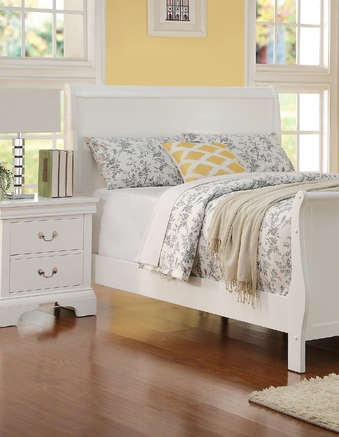 Product DescriptionProduct Description:-Smooth surfaces, curved panels and detailed lines drape this bedroom set bathed in a White color. This set features a sleigh bed and storage accessories with charming accent door handles offering a French-inspired bedroom décor.