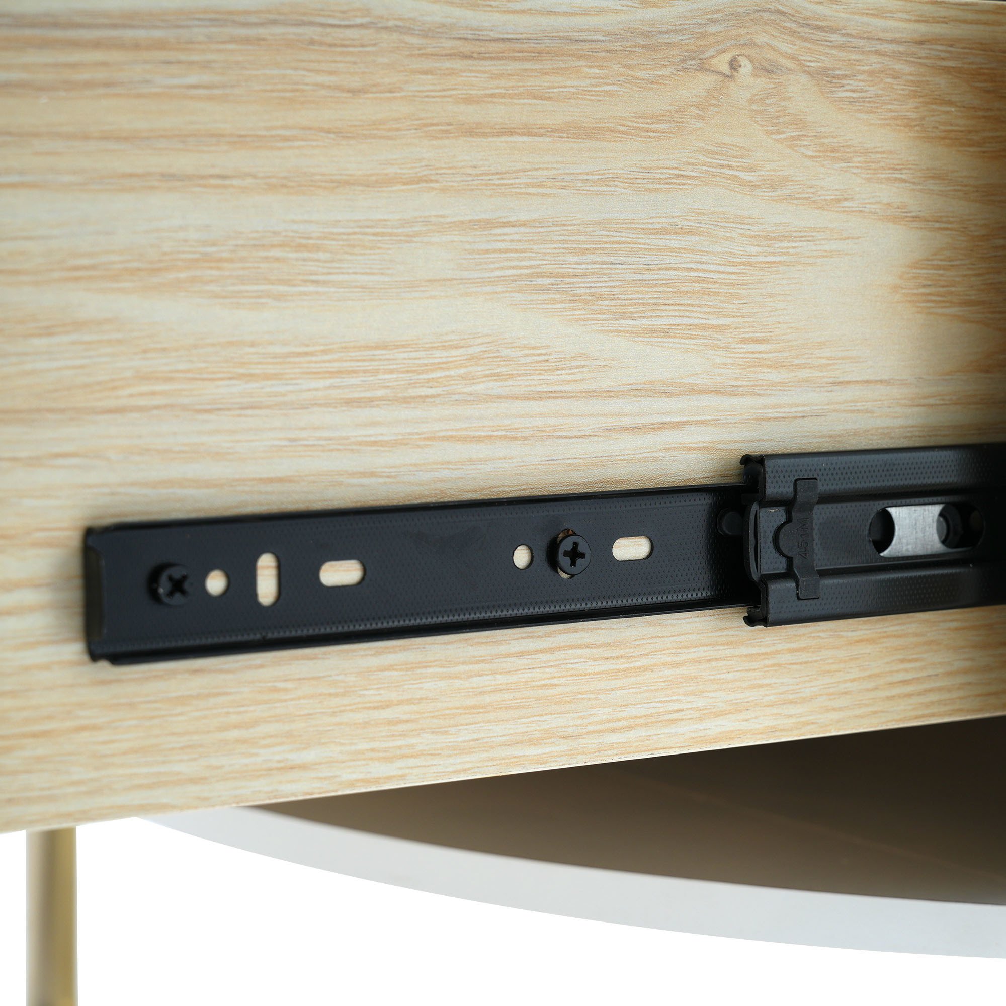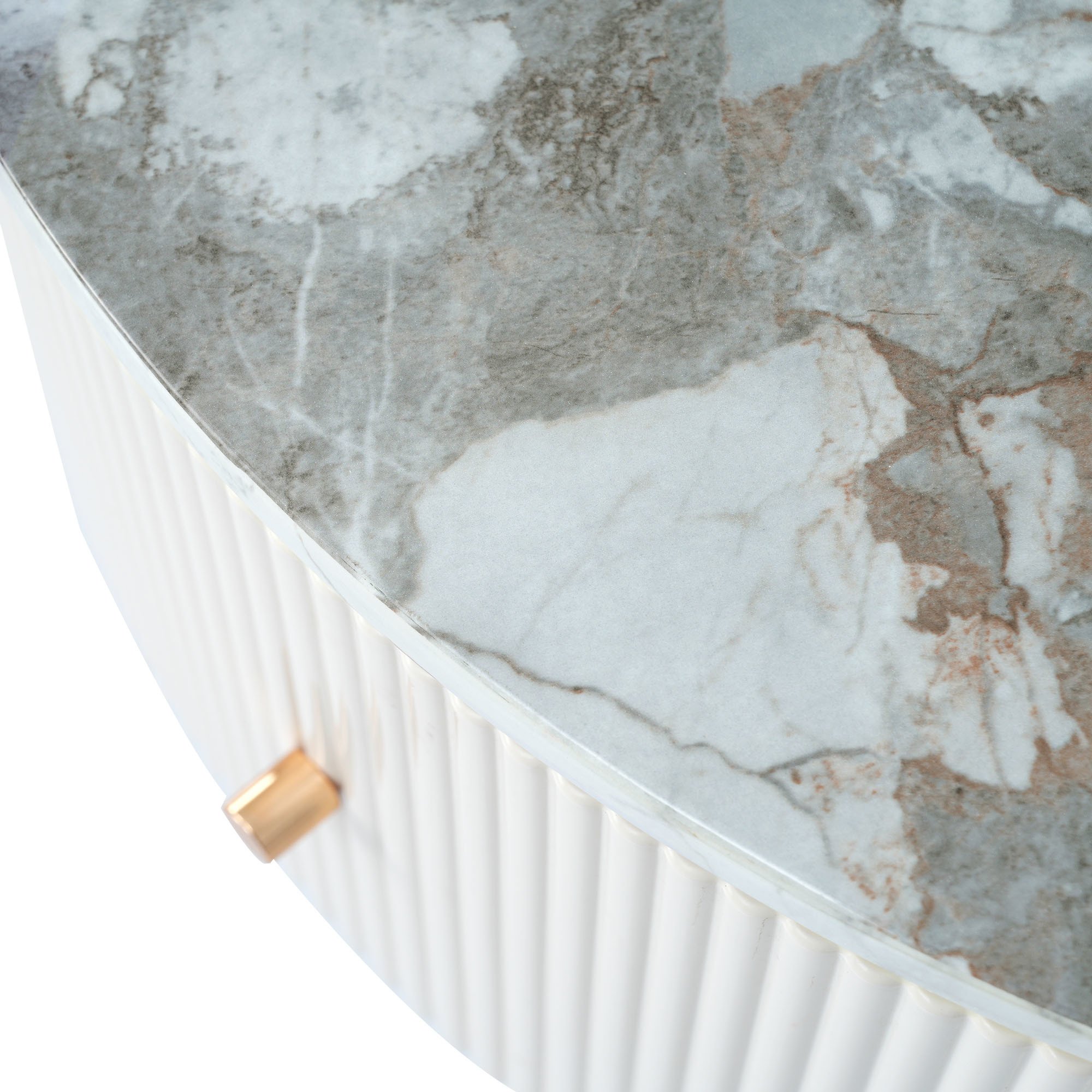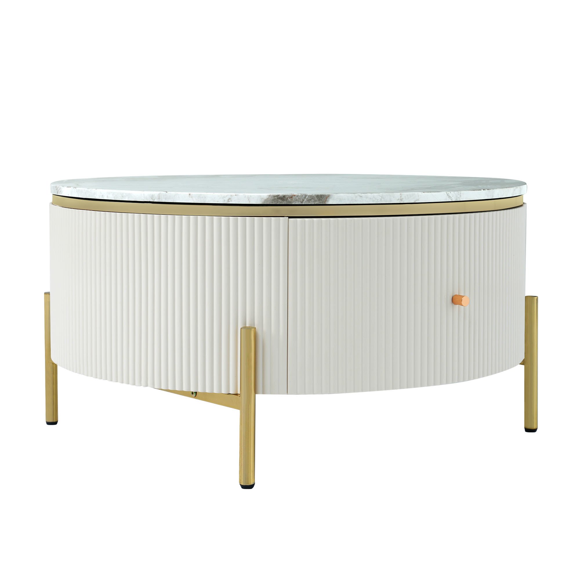 Ample StorageThe coffee table is equipped with two large drawers, providing ample storage space. These drawers are perfect for keeping your living room organized by storing items such as remote controls, magazines, books, or any other essentials you want to keep within easy reach but out of sight.Modern Round Coffee Table with 2 large Drawers Storage Accent TableProduct Size31.5"L x 31.5"W x 16.7"HShapeRoundBase MaterialMetalBase Type4 LegsTop ColorWhiteBase ColorGoldTop MaterialMDFStyleModernOriginChinaFeatureDrawersNumber Of Tables1Number Of Drawers2Number Of Packages1Weight Capacity120lbs; Drawers: 15lbsAssembly RequiredYes