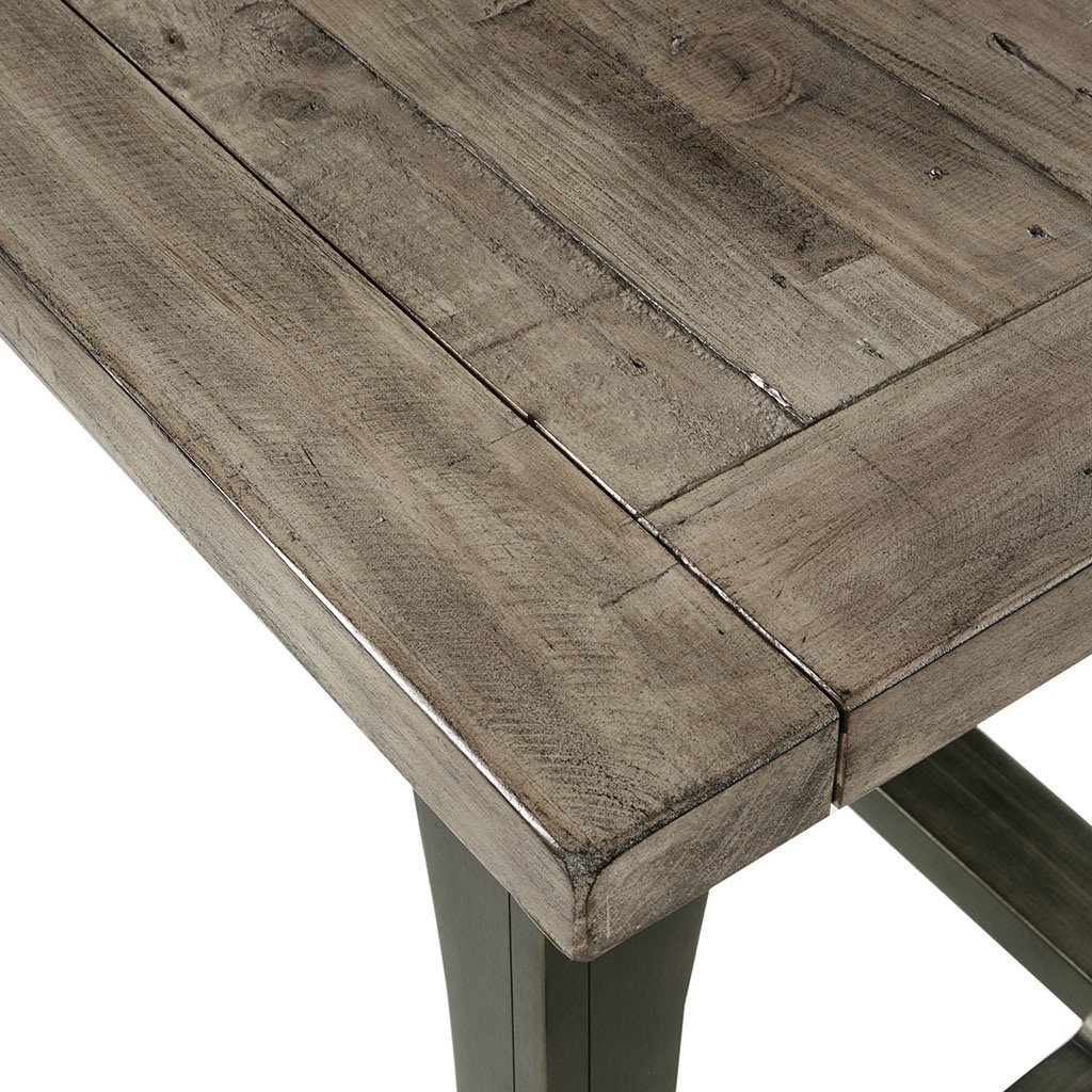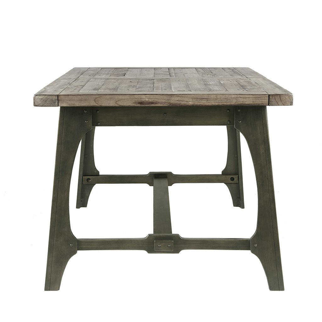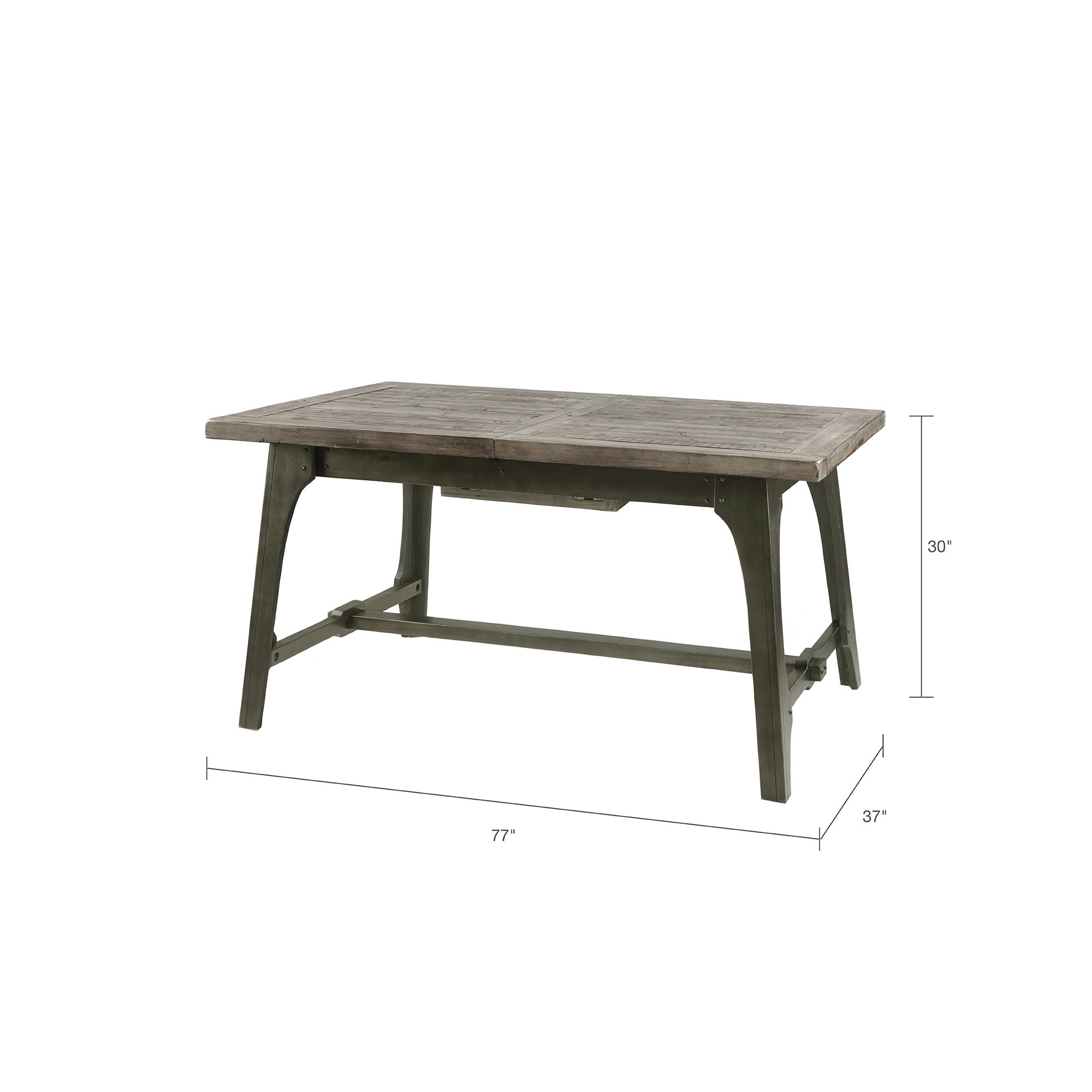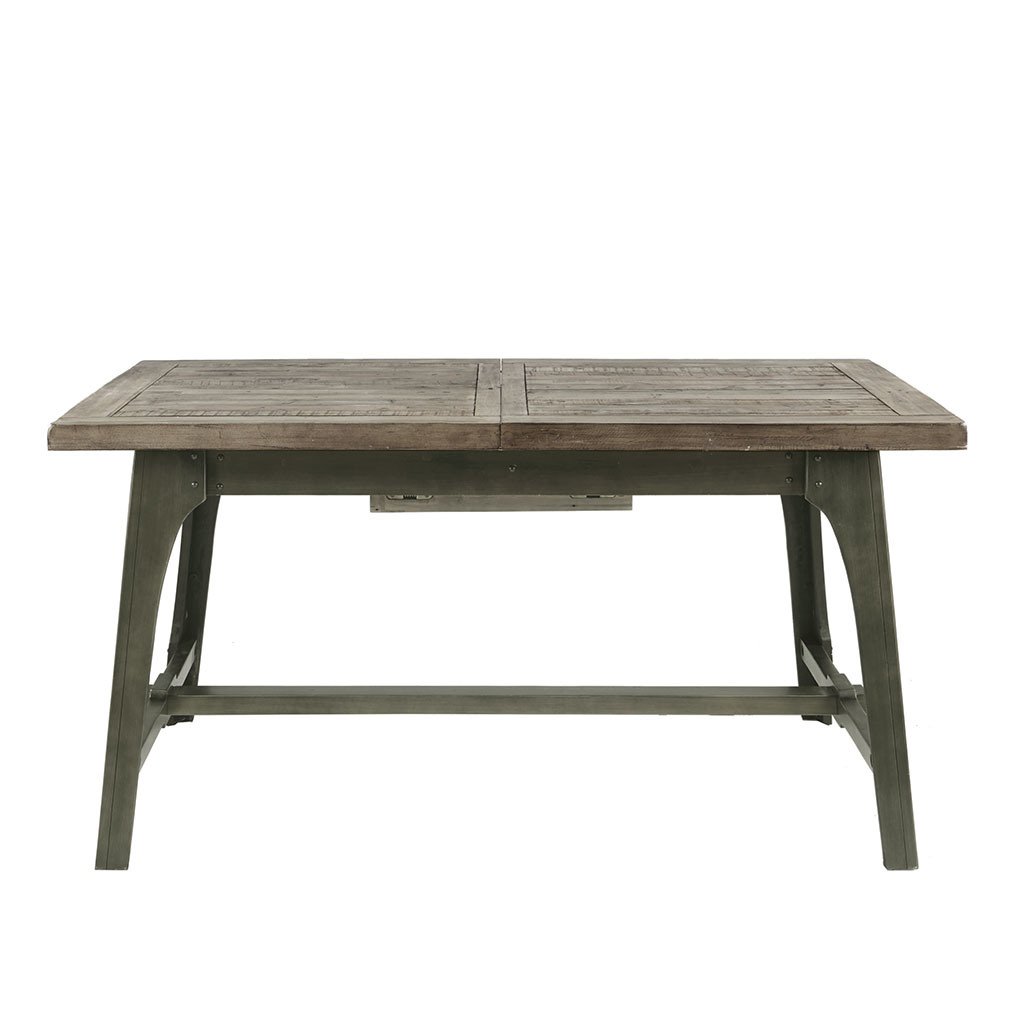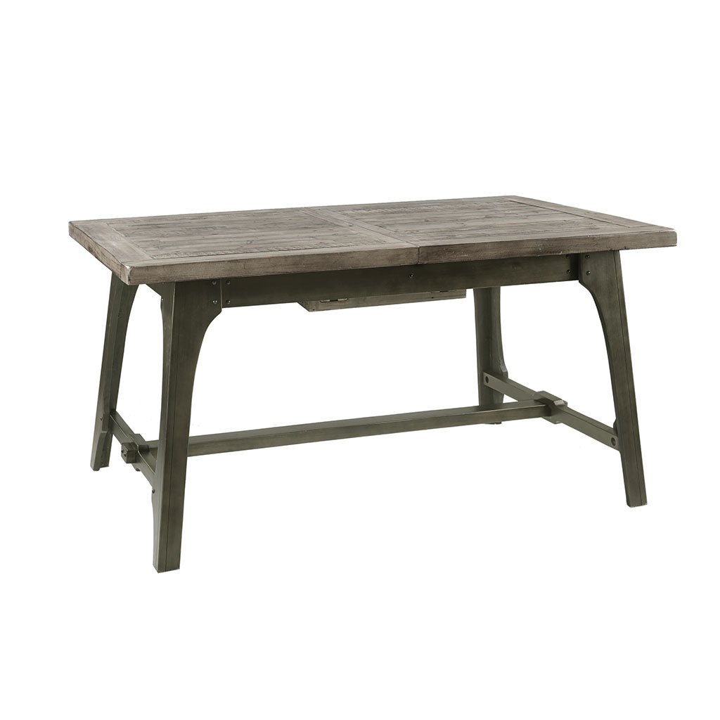 MATERIALMaterial: Wood Top, Wood Base Top Finish: Weathered Grey Base Finish: Antique BronzePRODUCT DETAILSSee below1 Extension Dining Table: 57"to75"W x 35"D x 30"HTable Top Size (WxDxThickness): 57"to75"W x 35"D x1.75"TLeg Size (WxH): 5"W x 28"HClearance Under Table Top: 24.75"Maximum Weight Capacity (Surfaces): 100 LBSLeaf Size: 18"W x 35"D x 1.75"TDESCRIPTIONOliver Extension Dining Table provides a strong and invigorating update to your dining decor. This rectangular dining table features a self-storing, 18-inch butterfly leaf to comfortably seat six people. The weathered grey finish of the hand-distressed wood top is complemented by the antique bronze hue on the wood legs, for a rich natural appeal. Give your dining room a modern rustic flair by incorporating this extension dining table into your decor. Leg assembly required.