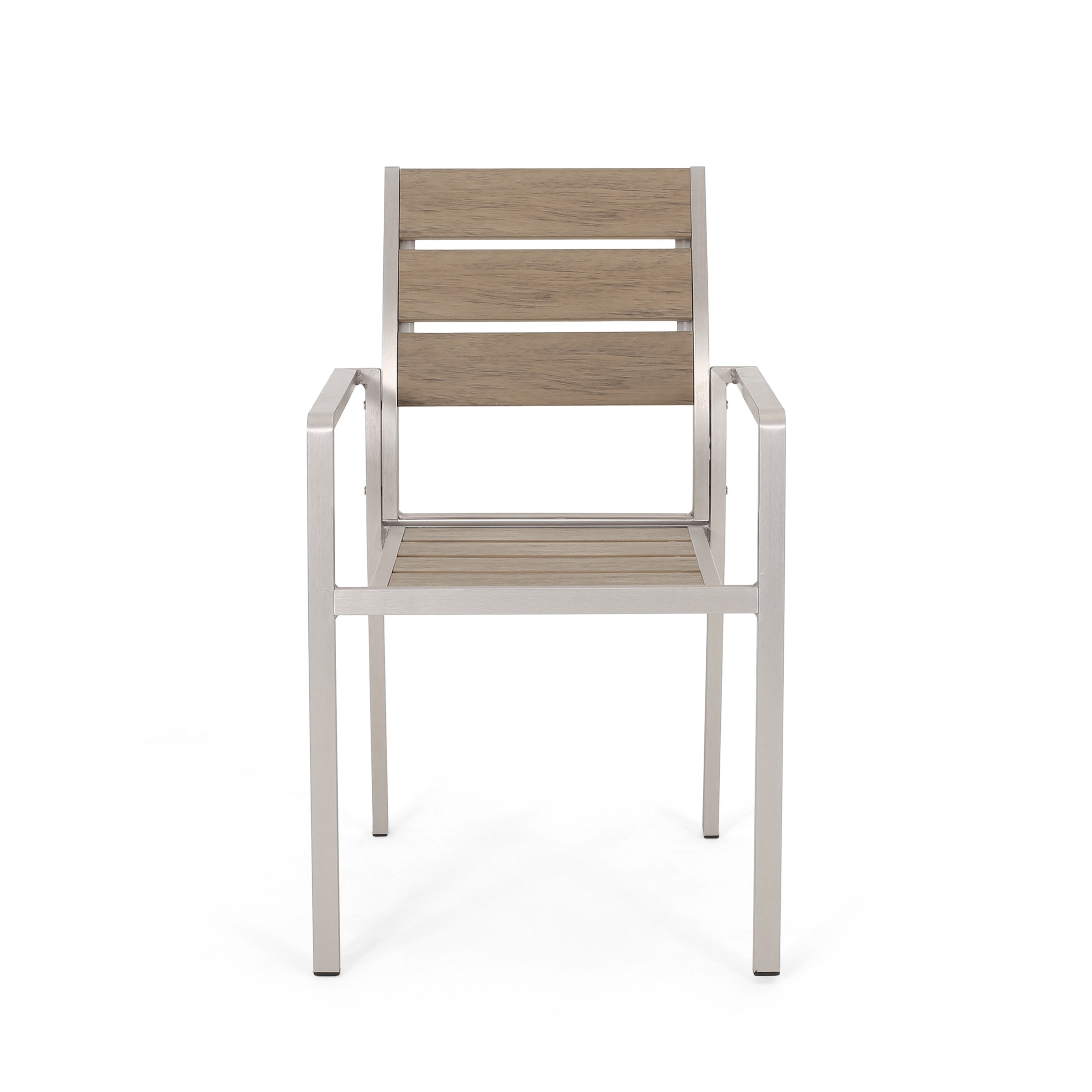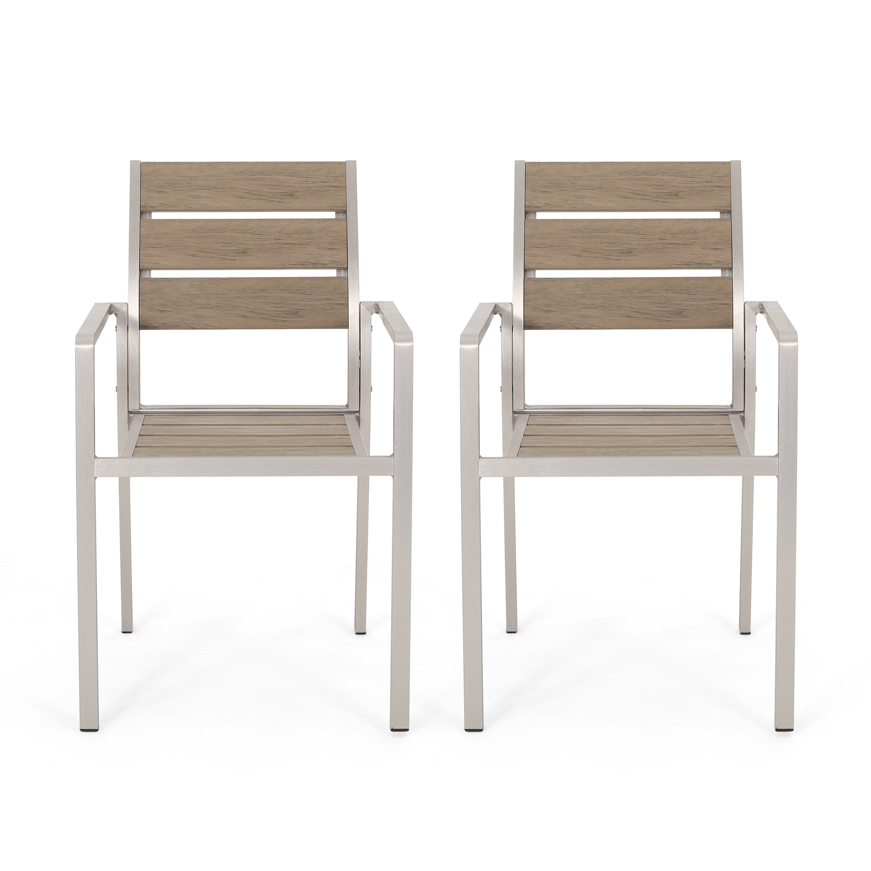 Outdoor Modern Aluminum Dining Chair with Faux Wood Seat (Set of 2), Natural and Silver