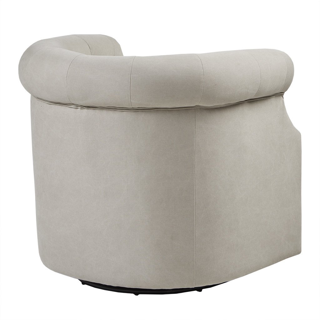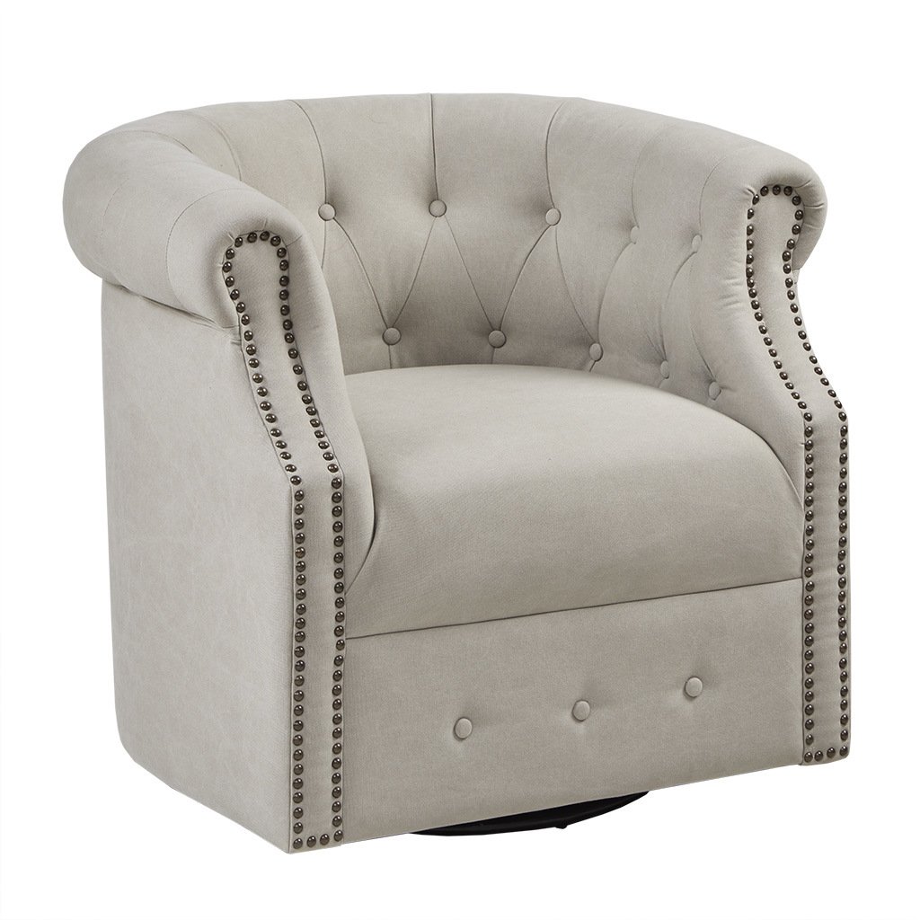 MATERIALMaterial: Beech pine,plywood,metal baseFabrication: 100% PolyesterFilling: FoamNailhead: BronzePRODUCT DETAILSSee below1 Swivel Chair: 33"W x 30.75"D x 29.25"HSeat Dimension: 19.75W" x 22D" x 18.25H"Seat Cushion Thickness: 8"Arms Size: 19.75"W x 28"HBack Rest Size: 15.5"W x 11"HMaximum Weight Capacity (Seating): 300 LBSDescriptionThe Owen Swivel Chair provides a chic transitional addition to your home décor. Featuring a low barrel back with button tufting accents, this swivel chair is upholstered in a beige fabric that creates a linen-like appearance. Bronze nail heads add a rich accent to the design, while the swivel base allows the chair to rotate 360 degrees. Handsome and dignified, this swivel chair expertly combines comfort and style to pair exquisitely with any transitional-style décor. Come fully assembled.