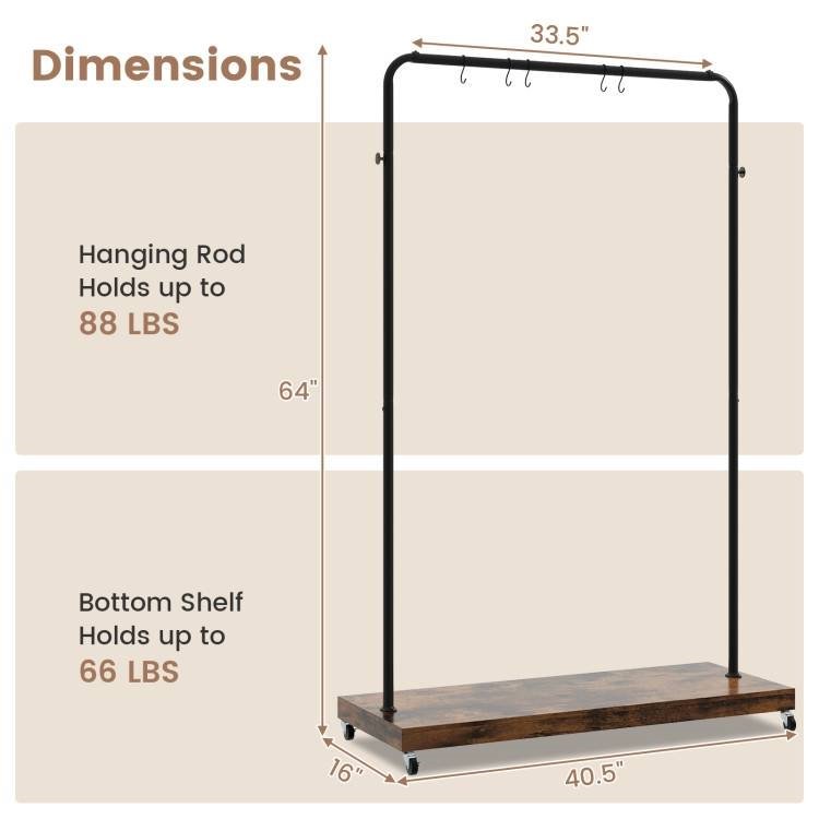 This Industrial Style Heavy Duty Metal Pipe Clothes Garment Rack with Bottom Shelf would be a great addition to your home. Say No to Clutters or Wrinkles: Featuring a 33.5" long hanging rod for clothes, the garment rack serves as a good clothes organizer with enough hanging area, thus to save you time on ironing out wrinkles. Besides, there are 2 additional hanging round hooks for bags or scarves. Multifunctional Design: With 5 S-shaped hooks for hanging plants, the 2-in-1 hanging rack can not only serve as a clothes rack, but also a plant stand. The 5 removable hooks can be flexibly arranged as you like, and you can use them separately for other purposes. Strong Load Bearing Capacity: Thanks to the heavy-duty painted metal pipes, the hanging rod holds up to 88 lbs. And the 1.6" thickened board makes the bottom shelf hold up to 66 lbs. Thus, the clothes rack can meet your needs. 360° Flexible Movement: Fitted with 2 universal casters and 2 lockable casters, the clothes organizer moves easily and brings convenient storage space anywhere you need in home, studio or retail store. You can stop it by stepping on the brakes! Humanized Design: The sturdy and practical bottom shelf offers ample space for shoes and storage baskets. It also helps enhance the stability of the rolling garment rack. What's more, the 2 anti-slip buckles at both ends prevent hangers from falling.