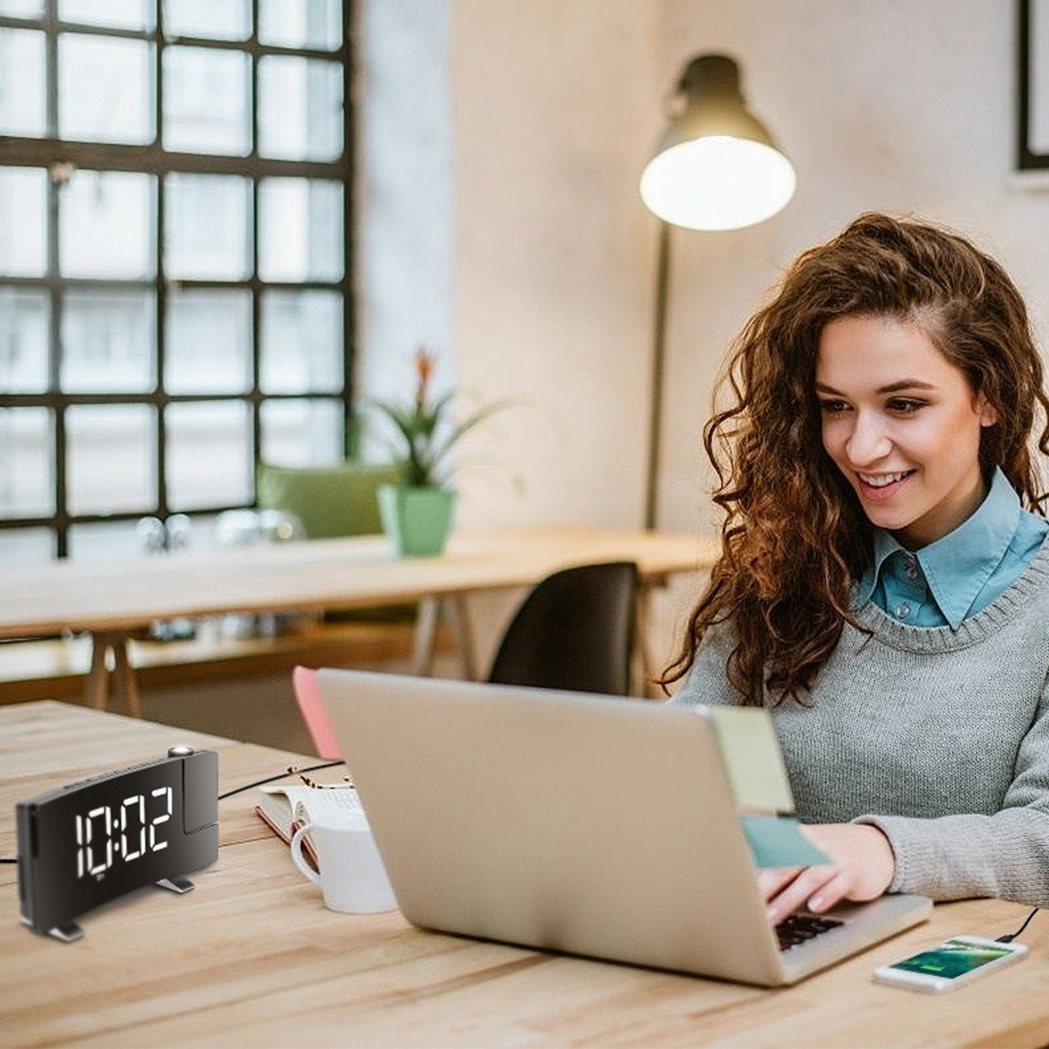 Projection Alarm Clock with Radio Function 7.7In Curved-Screen LED Digital Alarm Clock w/ Dual Alarms 4 Dimmer 12/24 Hour