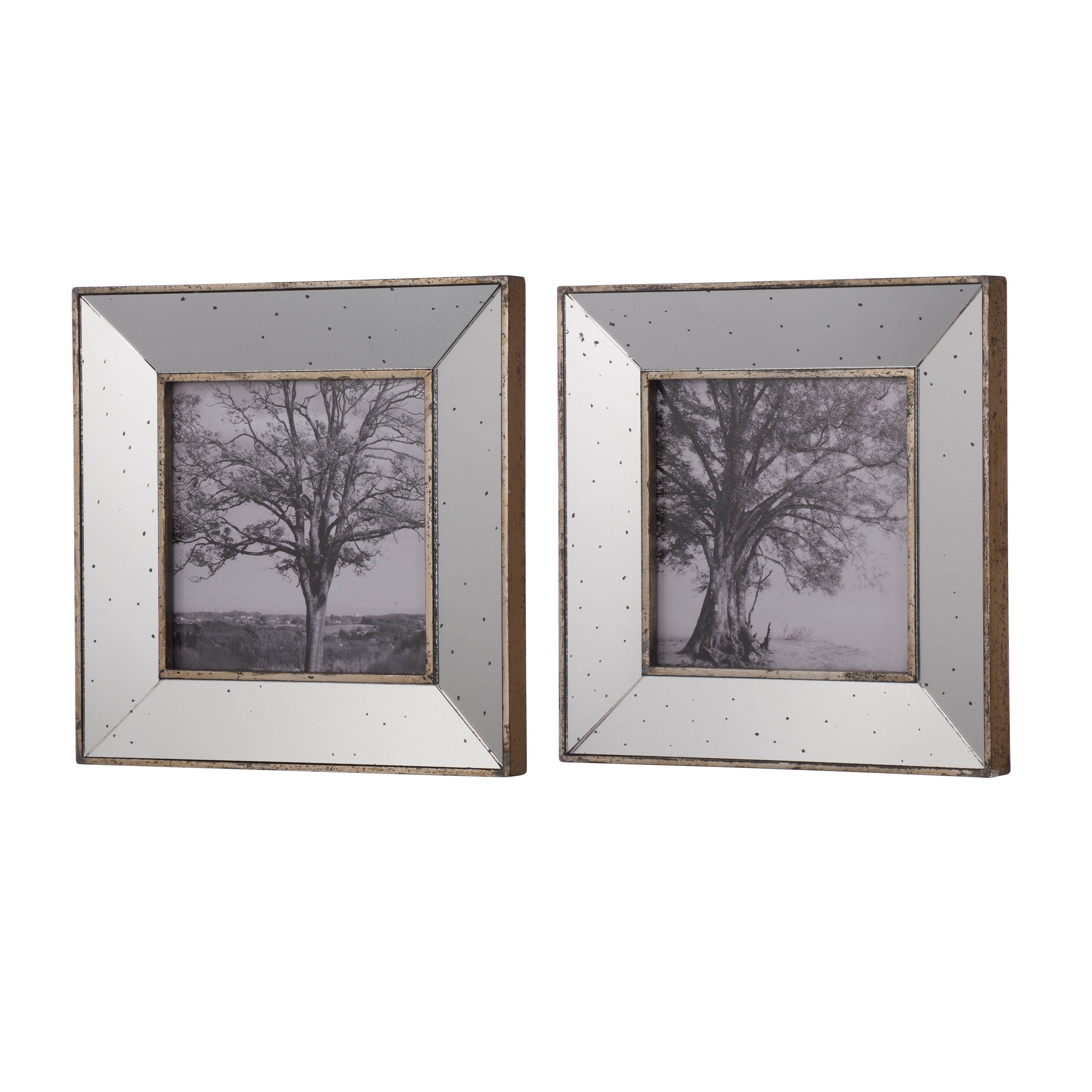 Each frame features a reflective mirrored surface, decorated with small speckles to give the illusion of age. Each set includes two matching 15×15″ frames.