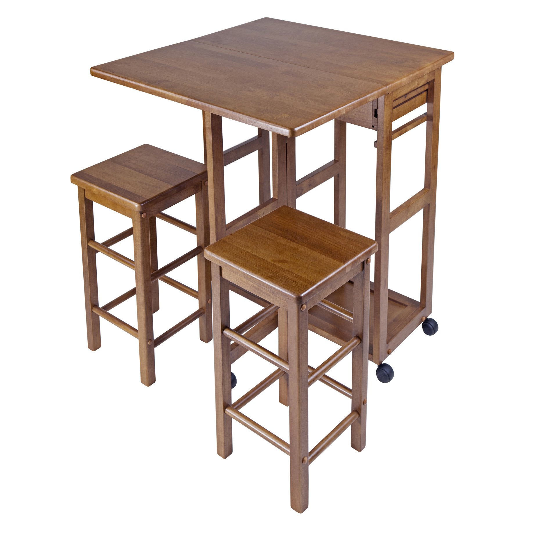 Suzanne 3-Pc Space Saver Set Teak lives up to its name and is easily manueverable while on wheels. This cart comes with two stools that tuck away within the cart when not in use. A square drop leaf extends and is able to accommodates two people. Use the cart in the kithen; dining room; or even family room as a dining arrangement or seating space. The stool's overall dimension is 11.4"W x 11.4"D x 20.8"H. When the dropleaf is folded; the cart measures 29.6"W x 15.4"D x 32.75"H with a table top dimension of 27.3"W x 14.8"D. Once the dropleaf is extended; the tabletop measure 27.3"W x 29.6"D. The unit is made of solid and composite wood in a teak finish. Assembly required.Overall Extended Size 29.6"W x 29.1"D x 32.75"H. Table closed size is 29"W x 15.7"D x 32.75"HTable surface with dropleaf extended 27.3"W x 29.6"D. Table surface with drop leaf down is 27.3"W x 14.8"D.2 squre stools each measures 11.4"W x 11.4"D x 20.8"H. Made of solid and composite wood in teak finish. Assembly requirednullnullnull This product meets the oversized requirement per UPS/FedEx. The shipping weight reflected is the dimensional weight. This product also meets the large package requirement per UPS/FedEx. The estimated shipping cost will include this fee. Large package is $70.00; applied when length plus girth [(2 x width) + (2 x height)] combined exceeds 130 inches. Additional Handling charge of $10.50 applied where a package's longest side exceeds 48 inches in length; the second longest side exceeds 30 inches in length; or total weight is greater than 70 lbs.This product meets the oversized requirement per UPS/FedEx. The shipping weight reflected is the dimensional weight. This product also meets the large package requirement per UPS/FedEx. The estimated shipping cost will include this fee. Large package is $70.00; applied when length plus girth [(2 x width) + (2 x height)] combined exceeds 130 inches. Additional Handling charge of $10.50 applied where a package's longest side exceeds 48 inches in length; the second longest side exceeds 30 inches in length; or total weight is greater than 70 lbs.
