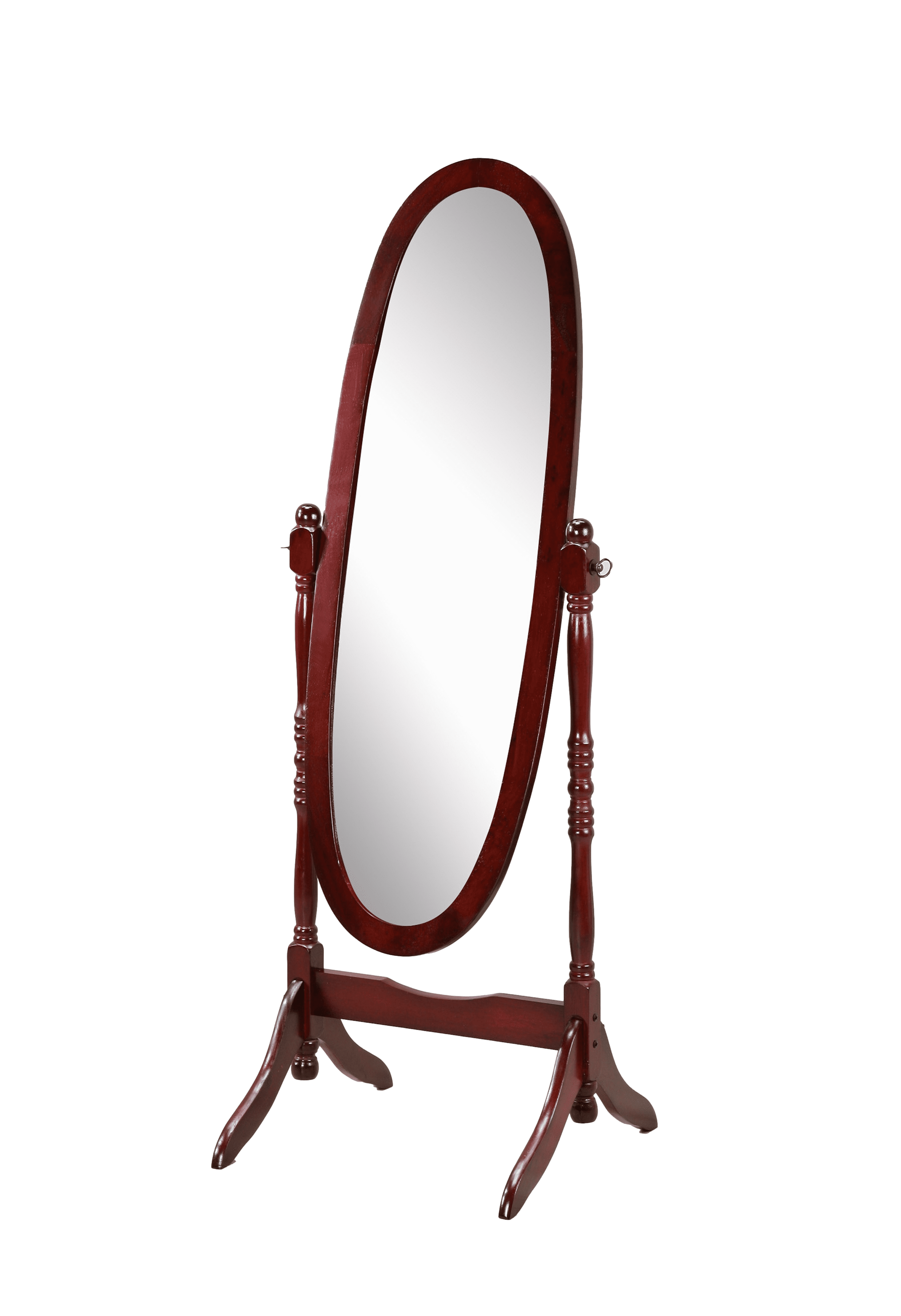 Traditional Style Wood Cheval Floor Mirror in Cherry finishBeautiful cheval style mirror for traditional decor; tilts for full-body reflection;Elongated oval glass mirror with wood frame and stand; finished in warm heirloom cherry finish;Freestanding design swings mirror between stylish turned posts and curved bracketed feet; stretcher for stability between legs;Some assembly required, Instruction & hardware in the box