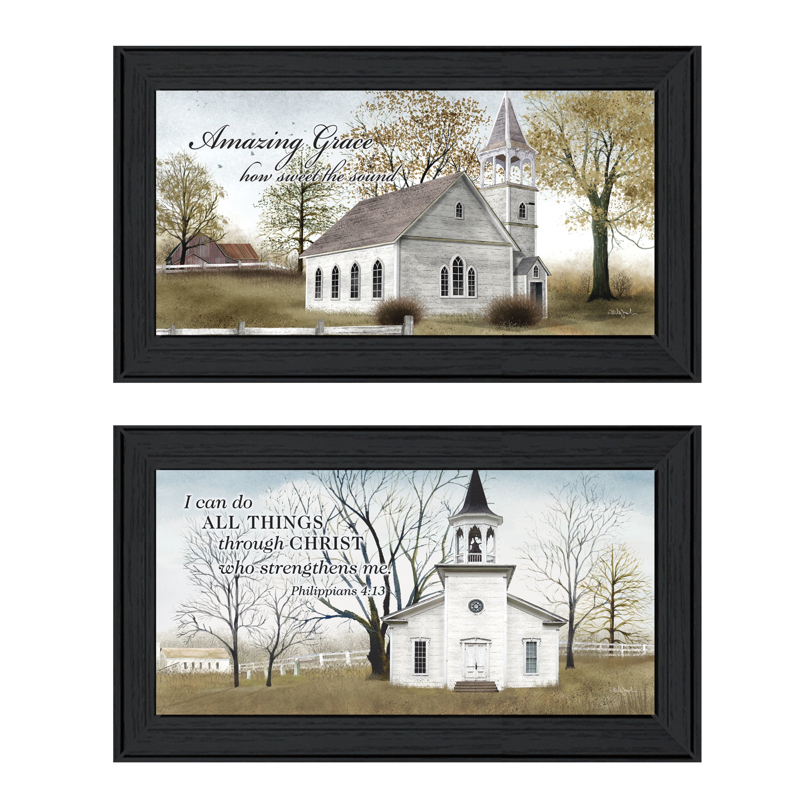 "Amazing Grace" vignette are 2-21" x 12" framed art print framed in a decorative black frame of the art of Billy Jacobs. It shows a pristine country church, red barn and the script "Amazing Grace...How Sweet the Sound" on one print; the other prints says; I can do ALL THINGS through CHRIST, who strengthens me: Philippians 4:13. Crafted By Skilled American Crafters And Coated With A Fade-resistant Texture, This Piece Has A Canvas-like Appearance That Will Last For Years To Come. Invest In A Piece That Is Truly One-of-a-kind.•Transform your walls with this stunning piece of art and bring a touch of modern elegance to your room. This stunning piece will not only add visual interest to any room but it's minimalist design will bring a sense of serenity to your space.•Tired of dull, empty walls in your home? We believe that walls should inspire, not bore. That's why we offer a wide range of wall art to suit any space from bedroom and kitchens to office and beyond. Give your walls a facelift with our printed arts and transform your space into a stylish and inviting home.•This framed wall art is hand-crafted in the USA of high-quality wood with the surface of the art coated with a fade-resistant texture which gives it a canvas-like appearance for many years of enjoyment in your home.•Bring a pop of colour and style to any room with our fully assembled and ready-to-hang wall art. With a wide selection of decorative pieces to choose from, you'll easily find the perfect match for your personal taste or to give as a thoughtful gift. Don't miss out on the opportunity to add some unique charm to your space.•Experience the unmatched quality and durability of American-made craftsmanship with this individually hand-crafted wall decoration art. Skilled crafters put their expertise into every piece to ensure it will stand test of time and bless your eyes for years to come.