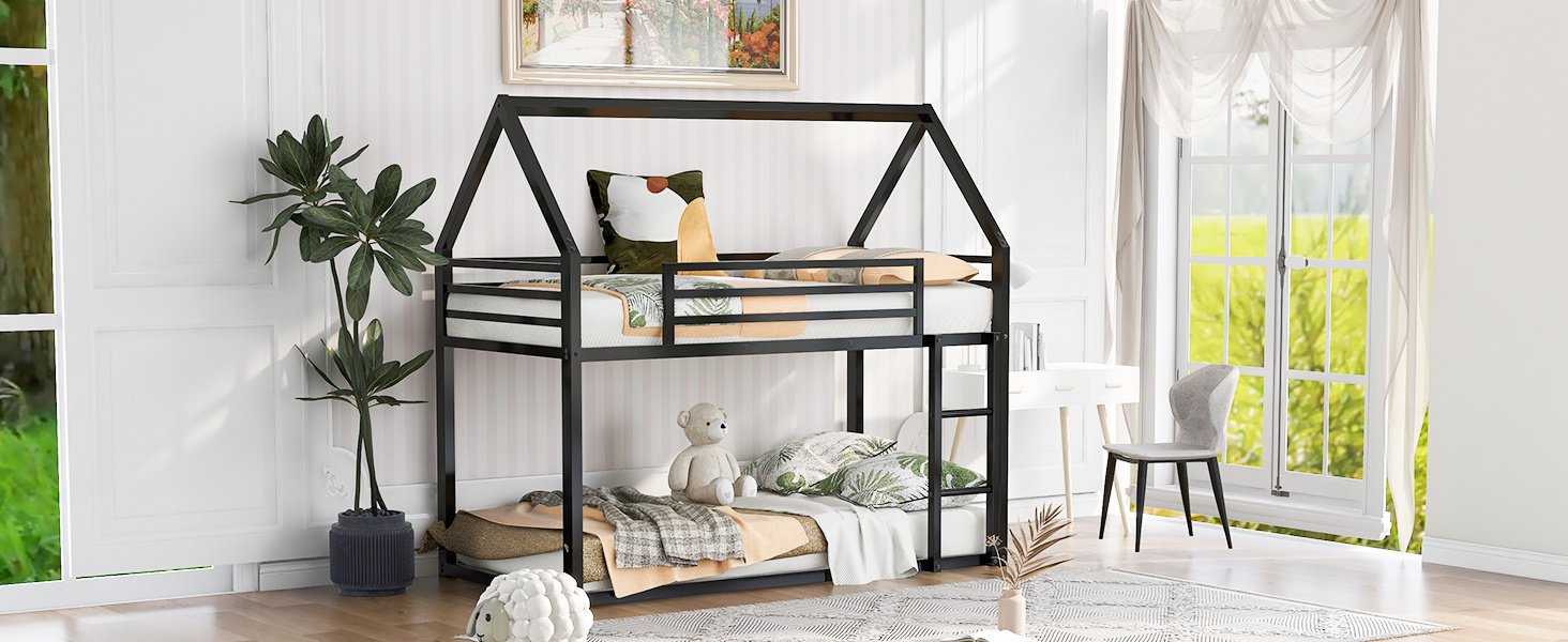 This is an all-time favorite when it comes to a space-saving sleeping solution! Crafted with strong and solid metal, the house bunk bed introduces forms and functions to the bedroom with its streamlined silhouette. With a house appeal, this bunk bed has a lower height than the average bunk bed, making it ideal for smaller spaces. Built with your little one's needs in mind, this bunk bed comes with a secured built-in ladder which can be put on left or right.