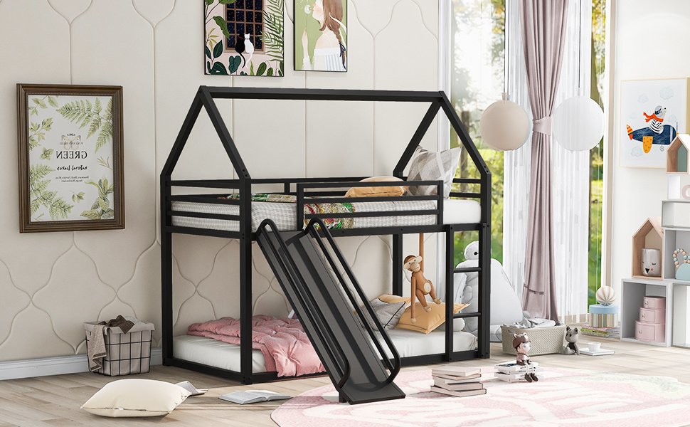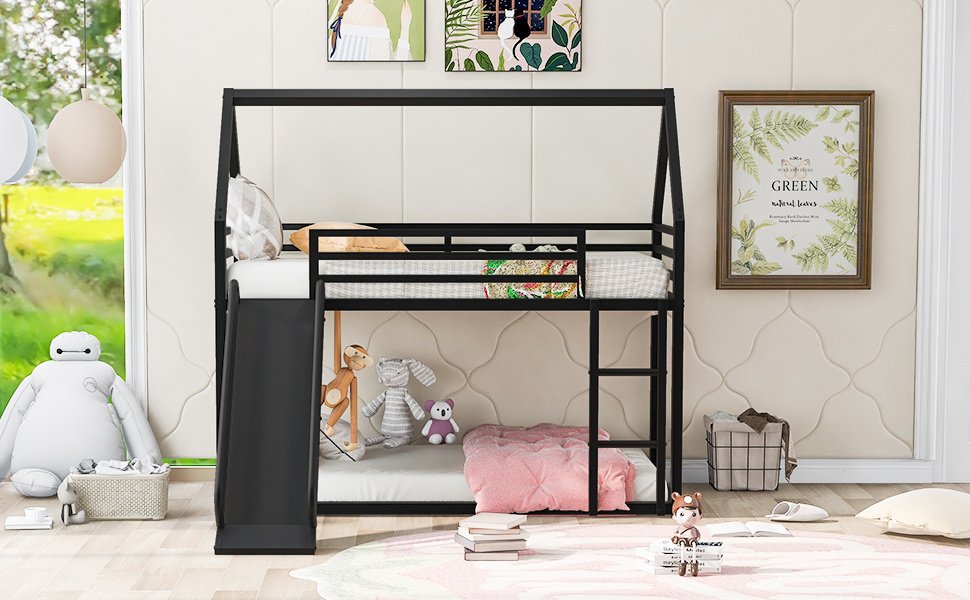 1.[House Bunk Bed] Crafted with a whimsical playhouse design,comes with slide,this twin size bunk bed frame with offers a comfortable and exhilarating experience during both sleep and playtime that will let their imaginations run wild.