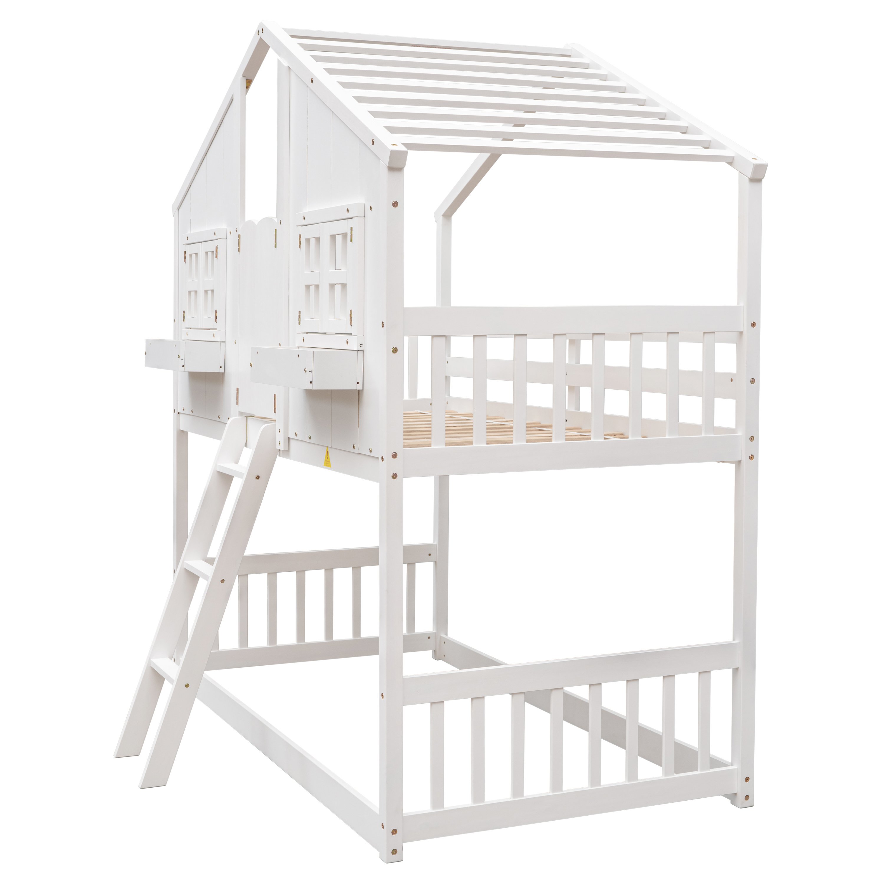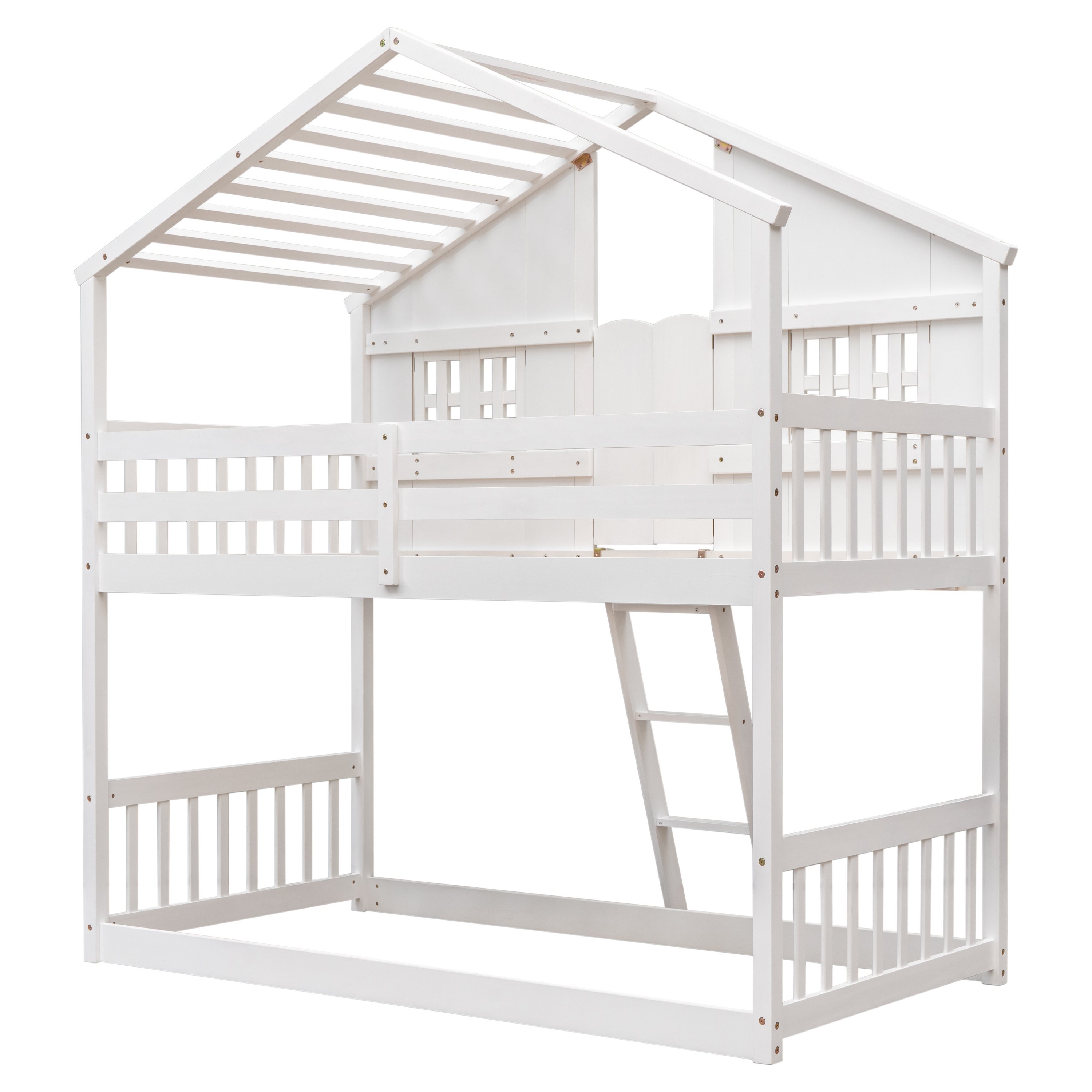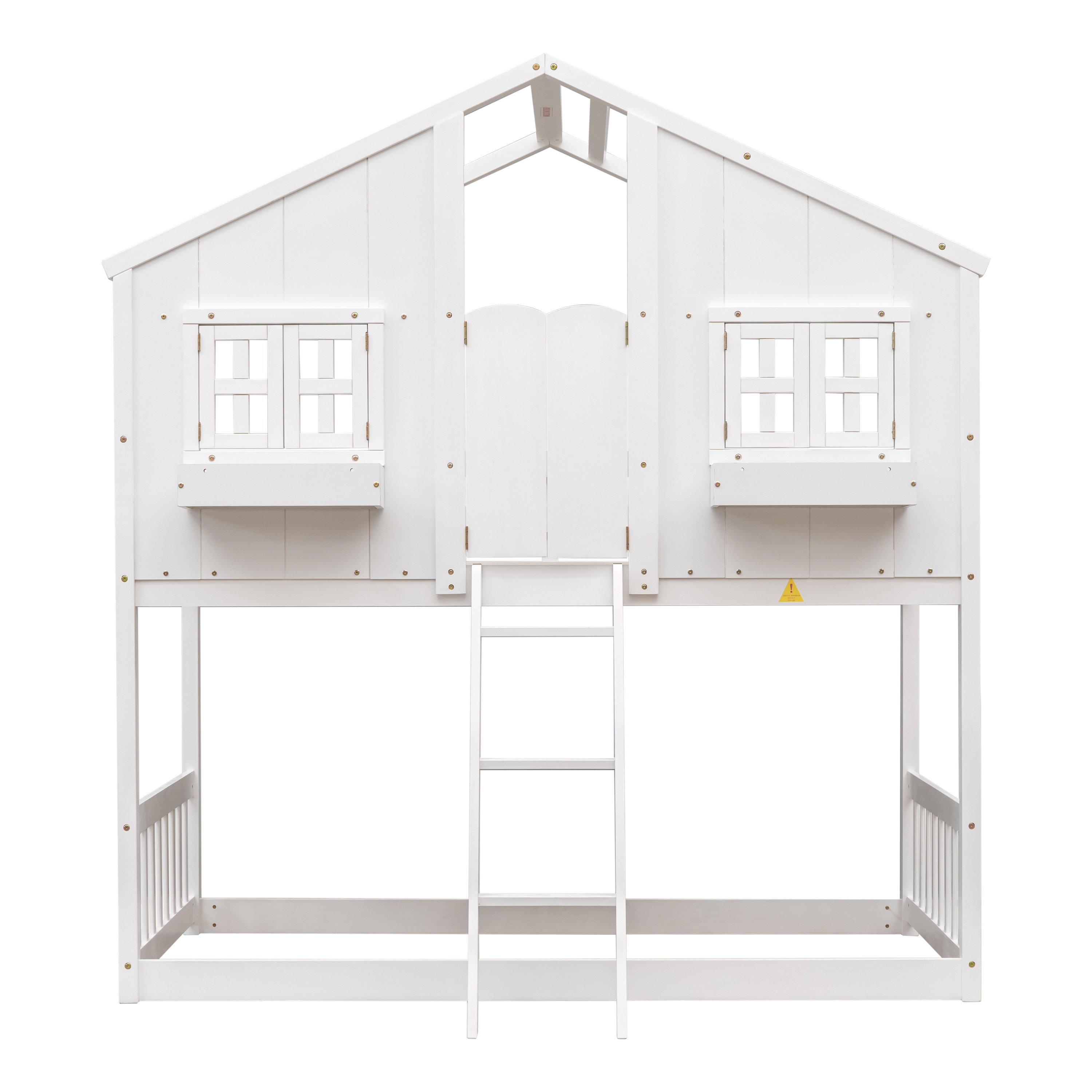 Twin over Twin House Bunk Bed with Roof , Window, Window Box, Door , with Safety Guardrails and Ladder