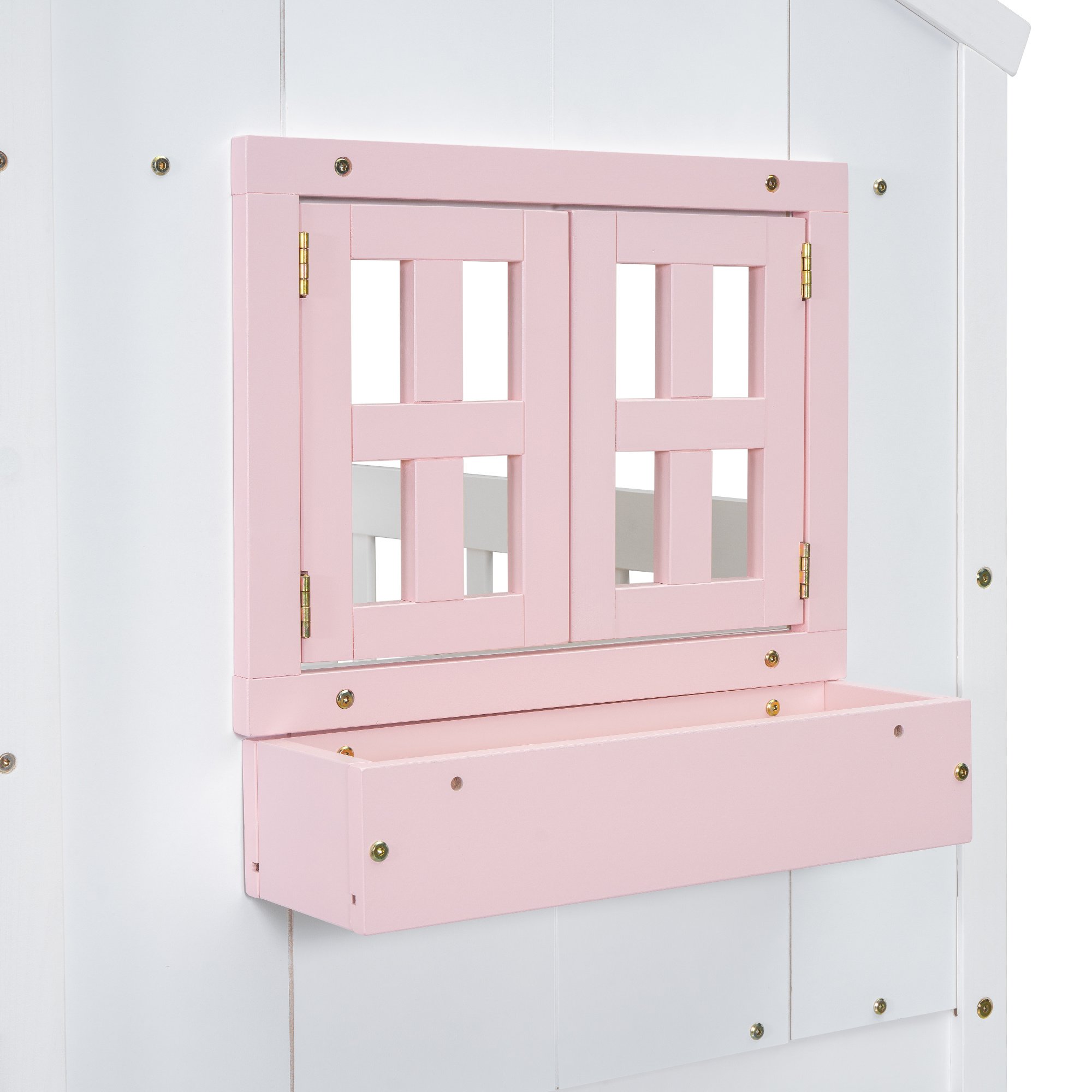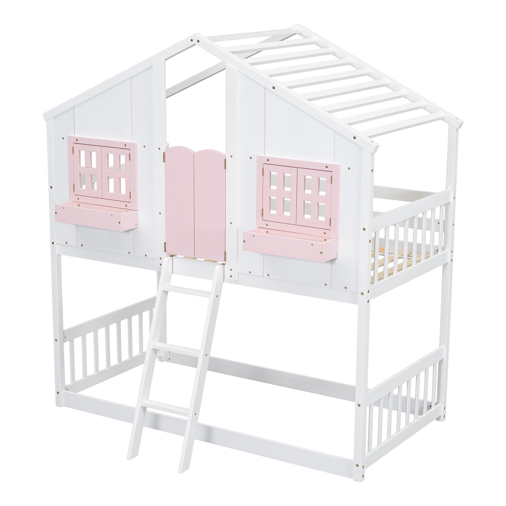 Twin over Twin House Bunk Bed with Roof , Window, Window Box, Door , with Safety Guardrails and Ladder
