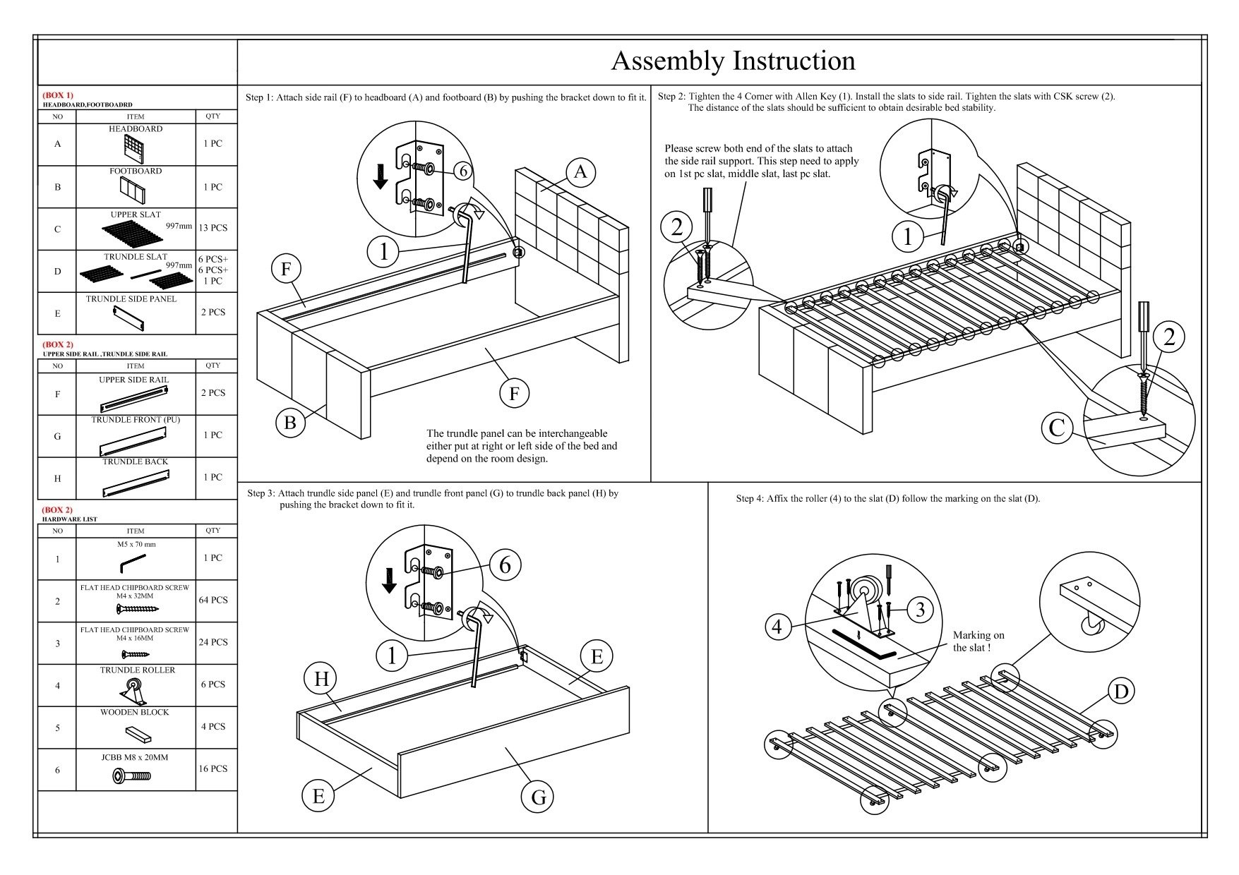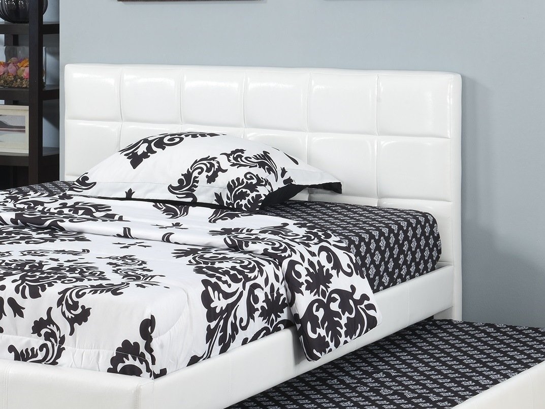 DescriptionDescription :- Style and function matters when it comes to this white colored faux leather upholstered Bedframe. It also includes a lower trundle with extra sleeping space for a guest. Now for a relaxing and lovely sleep, we bring to you this cozy option in the form of this massive comfortable full size bed With Trundle, White. This bed with a sleek and simple spread and square shape upholstered headboard maximize your rooms functions. Its modern and fashionable yet simple style makes this bed distinguished by the simply fashionable look. Dimensions : Twin Size Bed w Twin Trundle :- HB 39"H / FB 16"H w 12 WOODEN SLATS Listing includes - Twin Size Bed w Twin Trundle only.