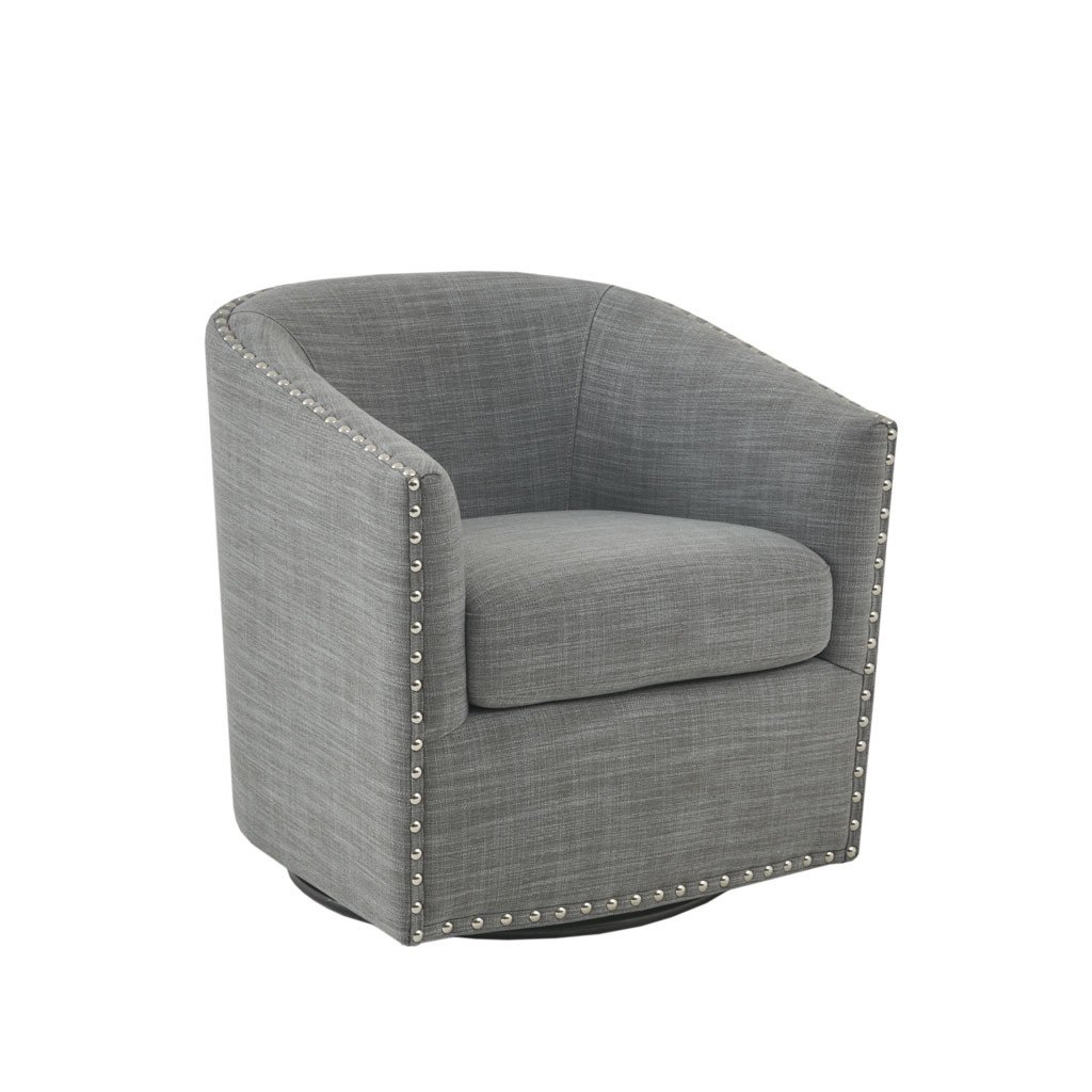MATERIALFrame Composition:Solid wood and plywoodLeg Material:black metal swivel baseArm Material:Solid wood and PlywoodFabric Composition:80% Polyester;20% LinenCushion or Upholstery Fill Material:FoamBack Fill Material:FoamMetal Finish:black metalbaseNailhead Color:Silver NailsPRODUCT DETAILSSee below1 Swivel: 28"W x 32.25"D x 30.5"HSeat Dimension: 19.5"W x 23.5"D x 20.5"HSeat Cushion Thickness: 7"Arms Size: 19.5"W x 25.5"HLegs Size: Dia. 24"Back Rest Size: 18.5"W x 10"HMaximum Weight Capacity (Seating): 300 LBSDescriptionRelax in the comfort and elevate your living room with the Tyler Swivel Chair. Upholstered in a rich grey fabric, this swivel chair features silver nail heads that line the arms and back for an elegant touch. The curved design creates a luxurious silhouette, while the high-density foam cushion provides a deep and comfortable seat. The swivel feature allows the lounge chair to rotate 360 degrees on its black metal base. No assembly required.