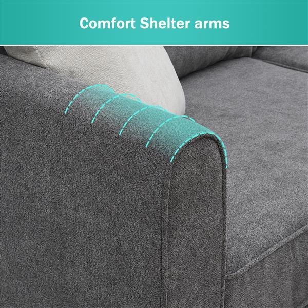Product DescriptionFor a living room with style, comfort and spacious seating, the 3-piece sectional sofa will satisfy your needs. This sectional features gray upholstery that's both versatile and trendy. And, when it comes to comfort, delivers with its huge seating area and extra accent pillows. With all these great features, you're in for a well-balanced room with character.FeaturesProduct TypeSofaProducts includedLeft-Arm-Facing Loveseat;Right-Arm-Facing Loveseat;WedgeSeating Capacity5Upholstery Material100% polyesterFrame MaterialSolid + Manufactured WoodLeg MaterialPlasticSeat Fill MaterialFoam; Pocket springBack Fill MaterialPolyesterRemovable CushionsYes.Seat,backrestReversible CushionsYes.Seat,backrestPillows IncludedYes,3 includedProduct CareLightly brush or vacuum frequently to remove dust and grime. Spot clean using a mild water-based solvent. Pre-test cleaning methods on a hidden surface. A professional cleaning service is recommended for an overall soiled condition.Arm TypeShelter ArmSeat StyleMultiple cushion seatBack TypeSemi-Attached PillowsSupplier Intended and Approved UseResidential UseCountry of OriginChinaAdult Assembly RequiredYes,Suggested of 2 PeopleAdditional Tools RequiredTools includedProduct DimensionsOverall91*91*33.5"(L*D*H)Loveseat dimensions57*28.5"(L*D)Back Height - Seat to Top of Back16.5"Arm Height - Floor to Arm25.3"Seat Height- Floor to Seat16.9"Leg Height - Top to Bottom3.9"Cushion thickness6"Pillow size14.5*14.5"Weight Capacity300lbs / seatNoticeThe packaging of the product package may be updated at any time, please refer to the actual product received.All colors on our website are for reference only, actual product colors may vary a little bit, due to different colour settings of every screen device.Please note: most of our sofas are hand-measured, therefore the dimensions are for reference only, and may marginally deviate.The cushions are vacuum-packed. After opening the package, please allow 72 hours to let it come back to its original shape.Keep it looking its best√ Blot spills immediately with a clean, absorbent white cloth.√ For indoor use only.√ Avoid direct sunlight.√ Do not leave newspaper or other printed material lying on surface.√ Dimensions of bench-made upholstery may vary slightly.√ Vacuum regularly.√ Spot clean using distilled water and water-based cleaning agents, foam or mild water-free cleaning solvents.√ Always test a small inconspicuous area first.Sectional Sofa Pieces: This sectional features gray upholstery that's both versatile and trendy. Includes left-arm-facing loveseat, wedge and right-arm-facing loveseat, 3 pillows are included in the package to meet various daily use needs.Comfortable design: Wide track armrests, cushions and legs for a clean, modern aesthetic. Comfortable foam, pocketed spring-filled pads supported by a curved spring structure. Heavy-duty S-shaped lines span the frame from front to back, providing even comfort and support throughout the seating area, preventing sagging.1 % Polyester upholstery: This easy-care fabric boasts a soft feel, yet it's tough enough for extensive, everyday use.High-quality Solid Wood: Frame joints are reinforced with corner blocks and heavy-duty metal fasteners for added strength and stability.Easy to Assemble: This L-shape sofa needs to be assembled, instructions manual and tool included, Overall size: 91"(L)* 91"(W)"* 33.5"(H).In order to facilitate the assemble, we use the plastic legs and strong semi-attached cushions to avoid too many accessories to install.Package: This sofa will be shipped from the US in a total of 5 packs.
