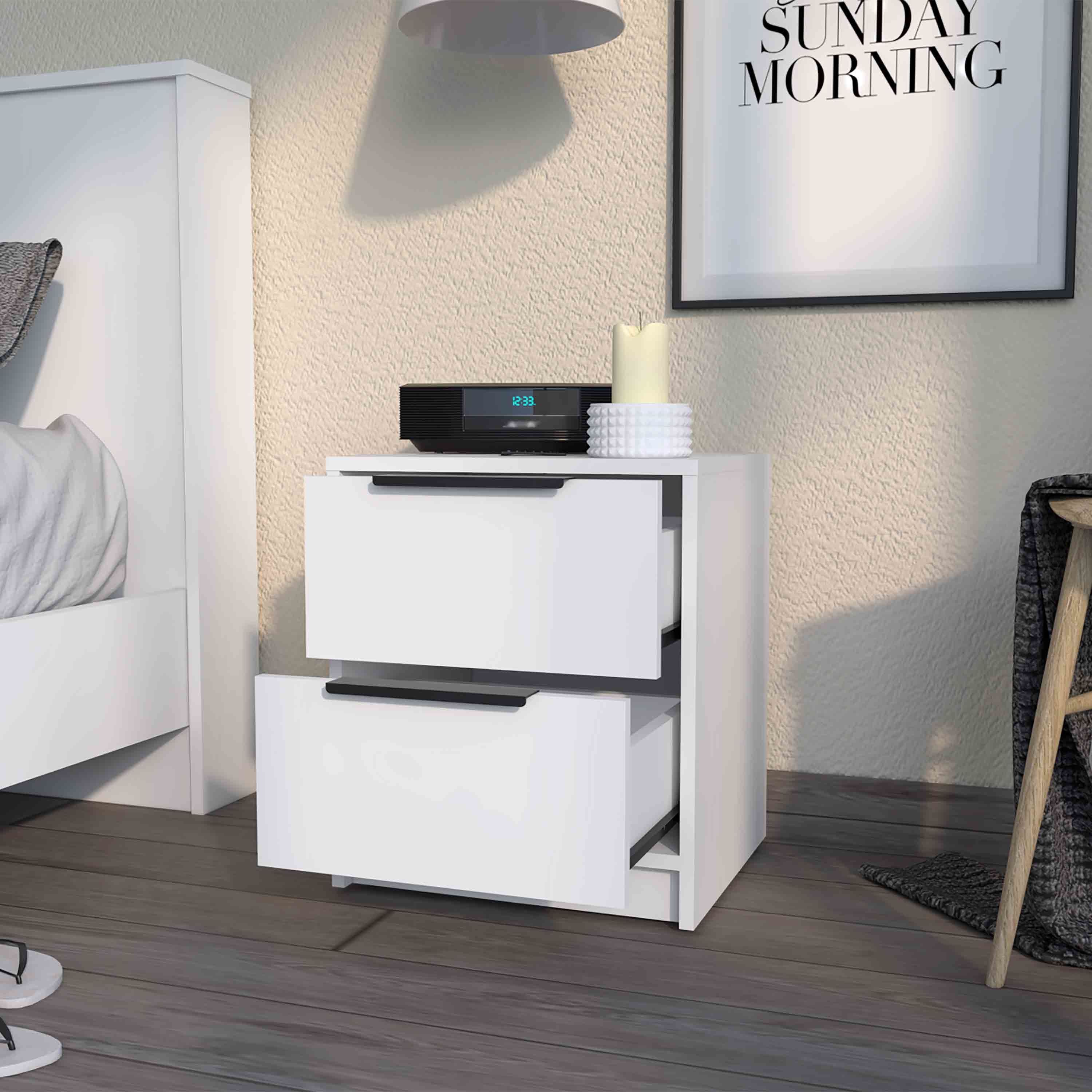 FM FURNITURE Washington Nightstand, Two Large Drawers ,White -Bedroom"This beautiful Nightstand is unique for your room or wherever you want to accommodate it, its excellent design gives a touch of elegance to the space you want to decorate. It is lightweight and very ergonomic. You can store books, notebooks, and many more accessories such as stuffed animals or photographs. It is a piece of furniture that gives life to the space where you want to put it. Buy it now The Washington nightstand is an excellent product with a fantastic design. The combination of colors is a great touch. This nightstand will provide you that extra storage space for your personal belongings nest to your bed or sofa. Plenty of top surface space allows you to place your photos, magazines, or books. A shelf below and two drawers are great options for that extra storage space you want next to your bed.