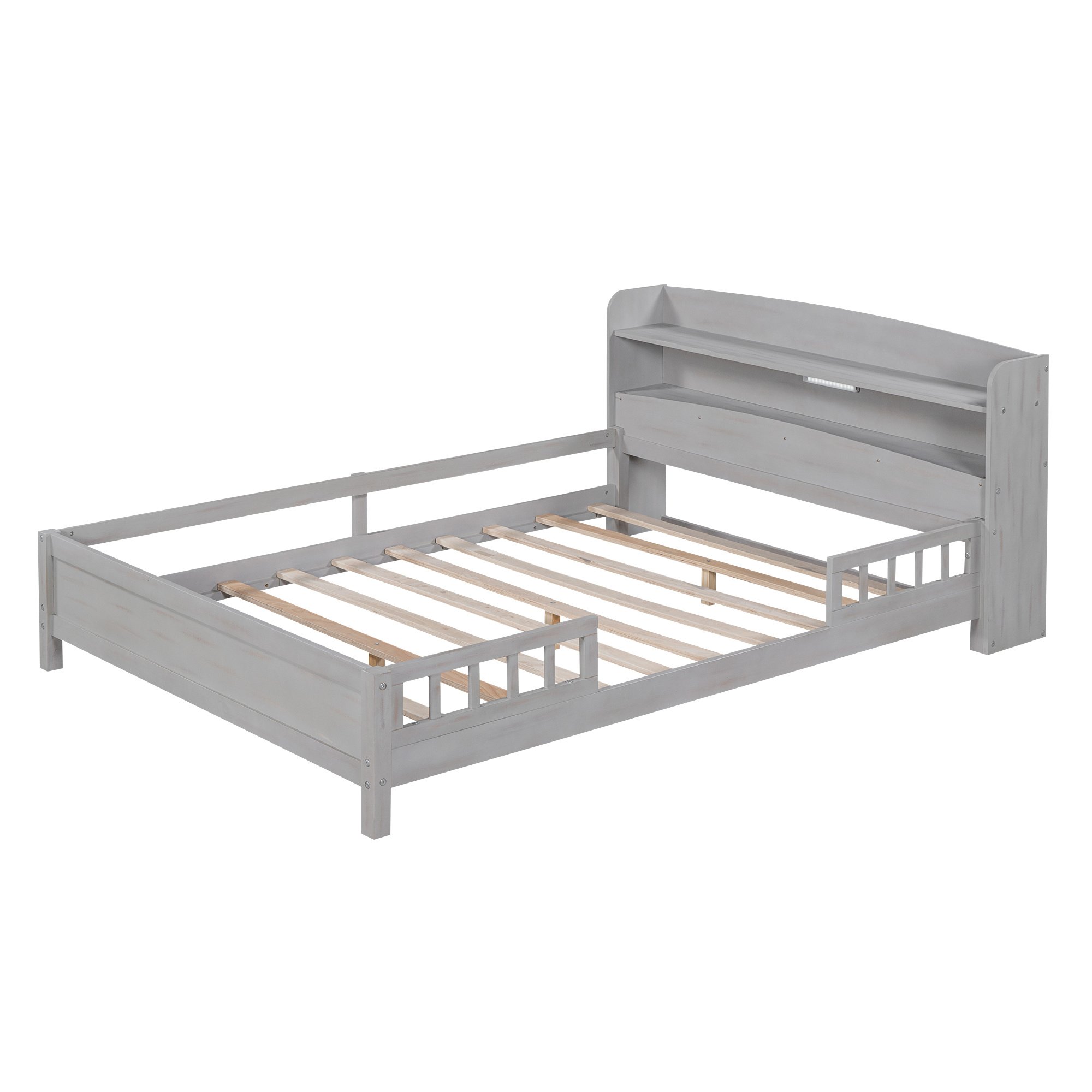 Crafted by white or antique grey finish, this platform bed will suit any home style. The multifunctional headboard is not only a space-saving design but also an amenity with LED light, provides a light source for activities before you fall asleep. The guardrails guarantee you a good night's sleep.