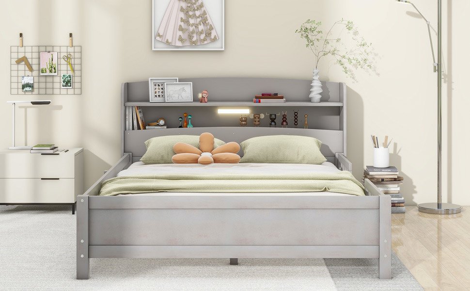 Wood Full Size Platform Bed with Built-in LED Light, Storage Headboard and Guardrail