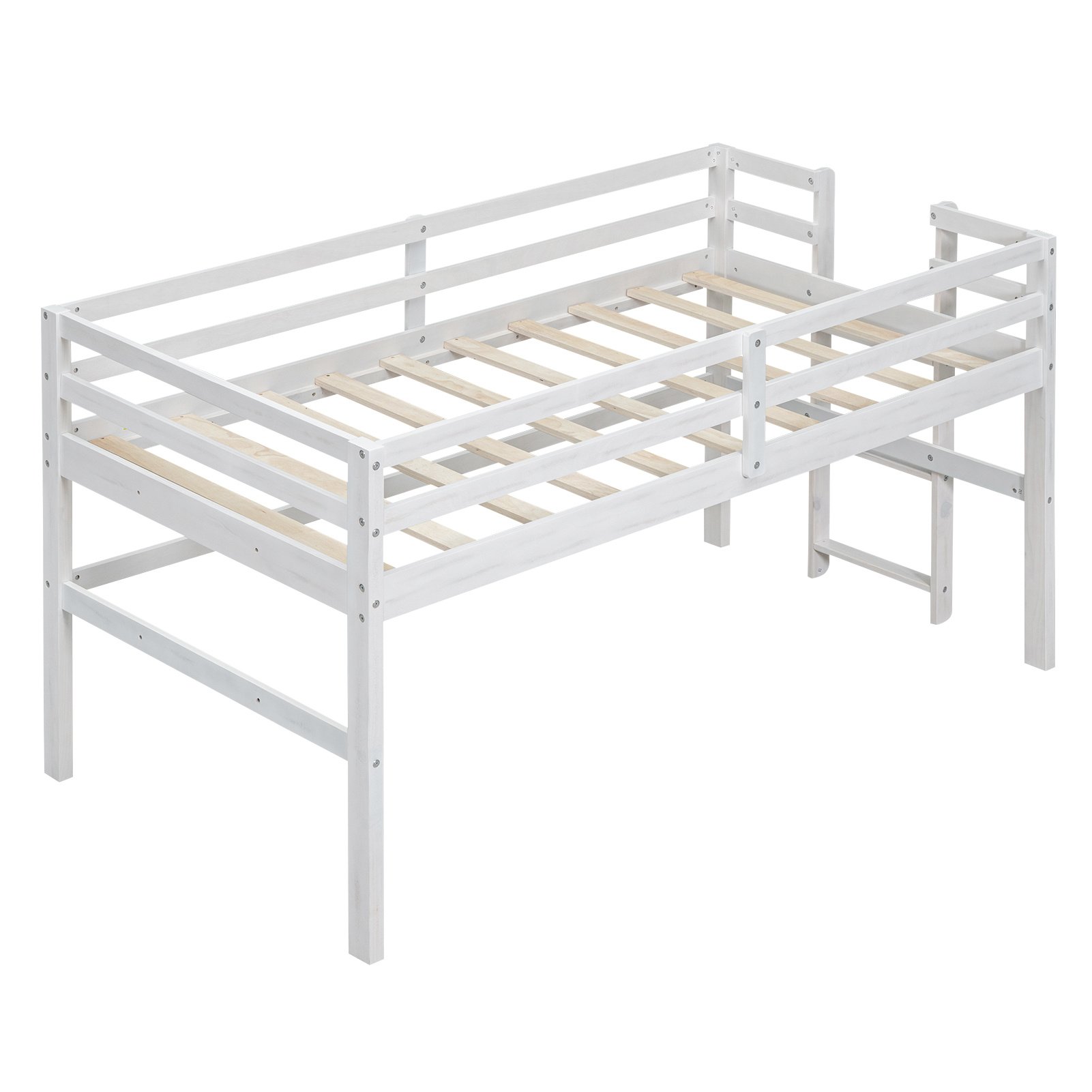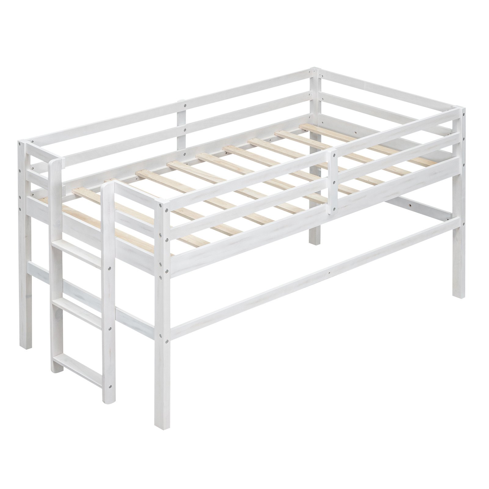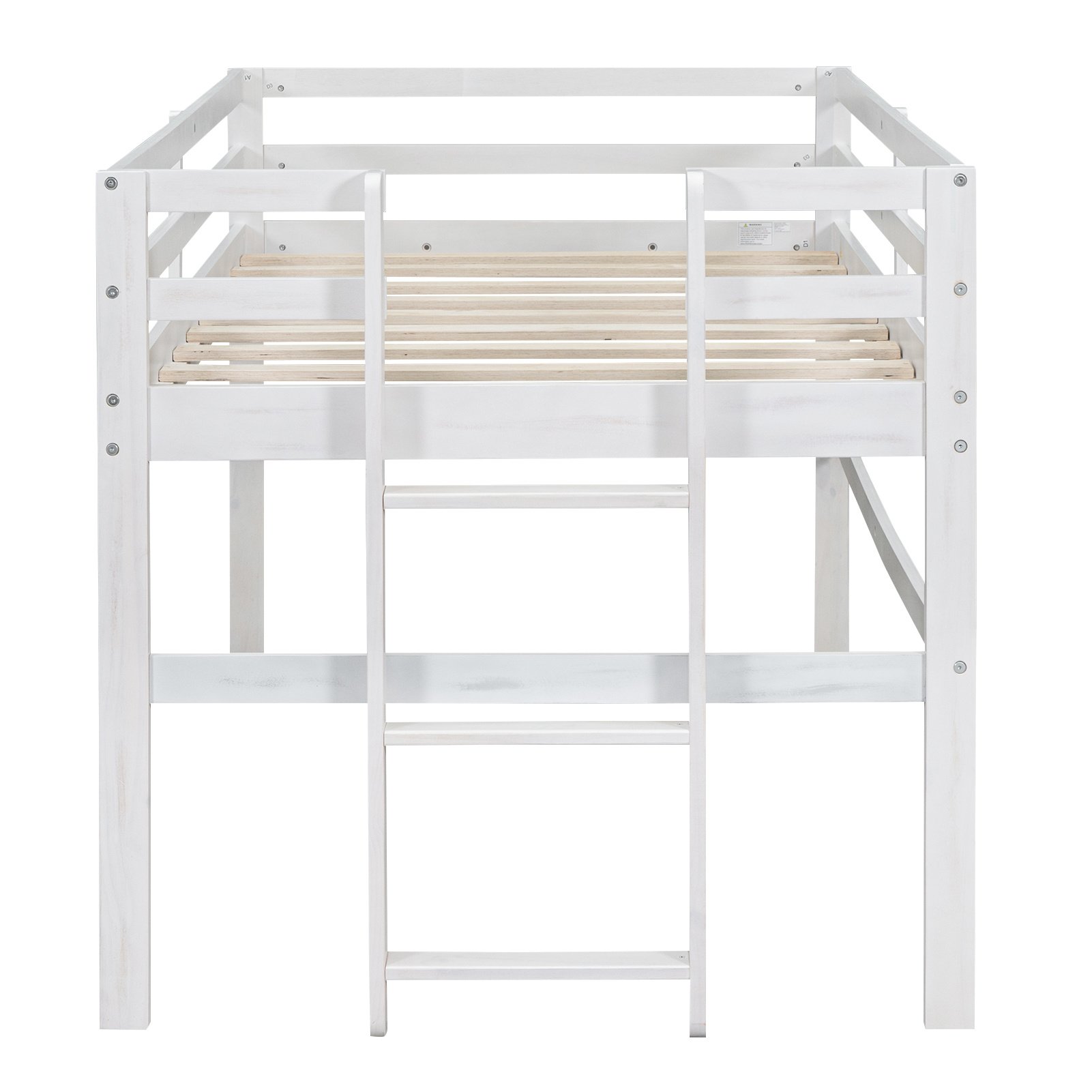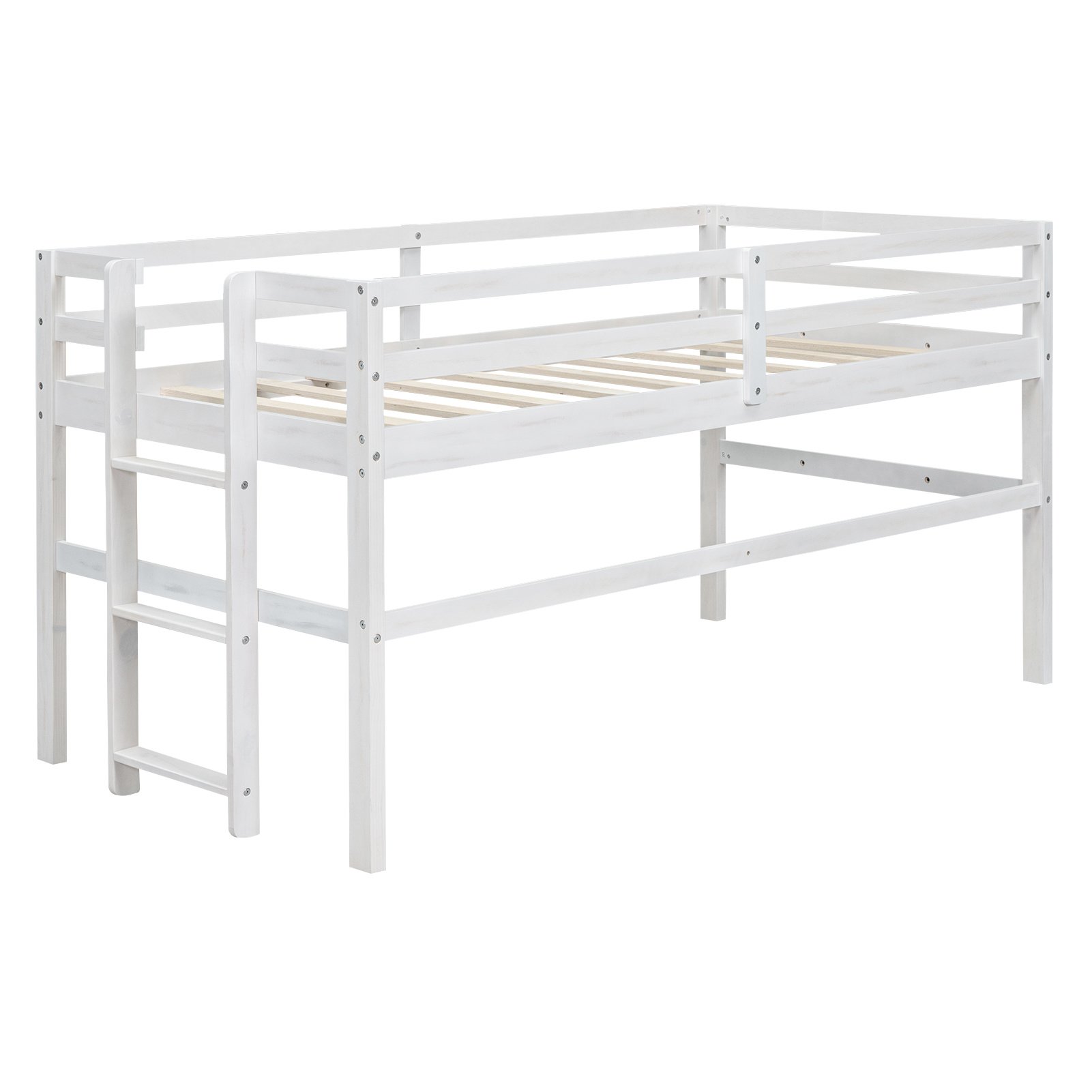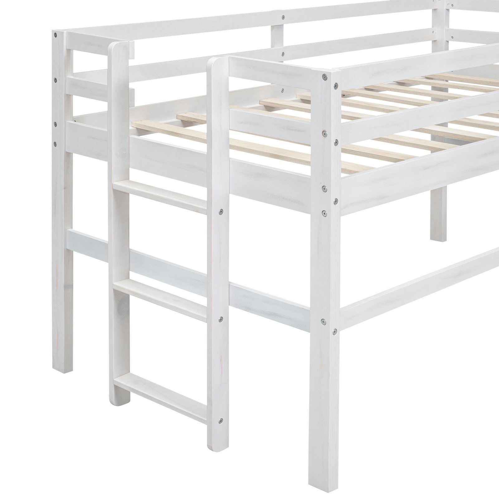 Wood Twin Size Loft Bed with Side Ladder, Antique WhiteHaving a bed at the same time can provide fun to play. This loft bed is a good choice. The upper bed can be used to have a good dream, the space below can be used arbitrarily. The ladder is attached to the side of the bed and the vertical design is space-saving, reducing the coverage area of the bed. There's spacious space under the bed, you can decorate it as a small playground or use it for storage, it's all up to you. Constructed of pine wood and high-quality MDF, the loft bed can withstand the test of time and won't make any noise after long-time use.