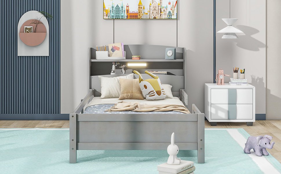 Home > Wood Twin Size Platform Bed with Built-in LED Light, Storage Headboard and Guardrail